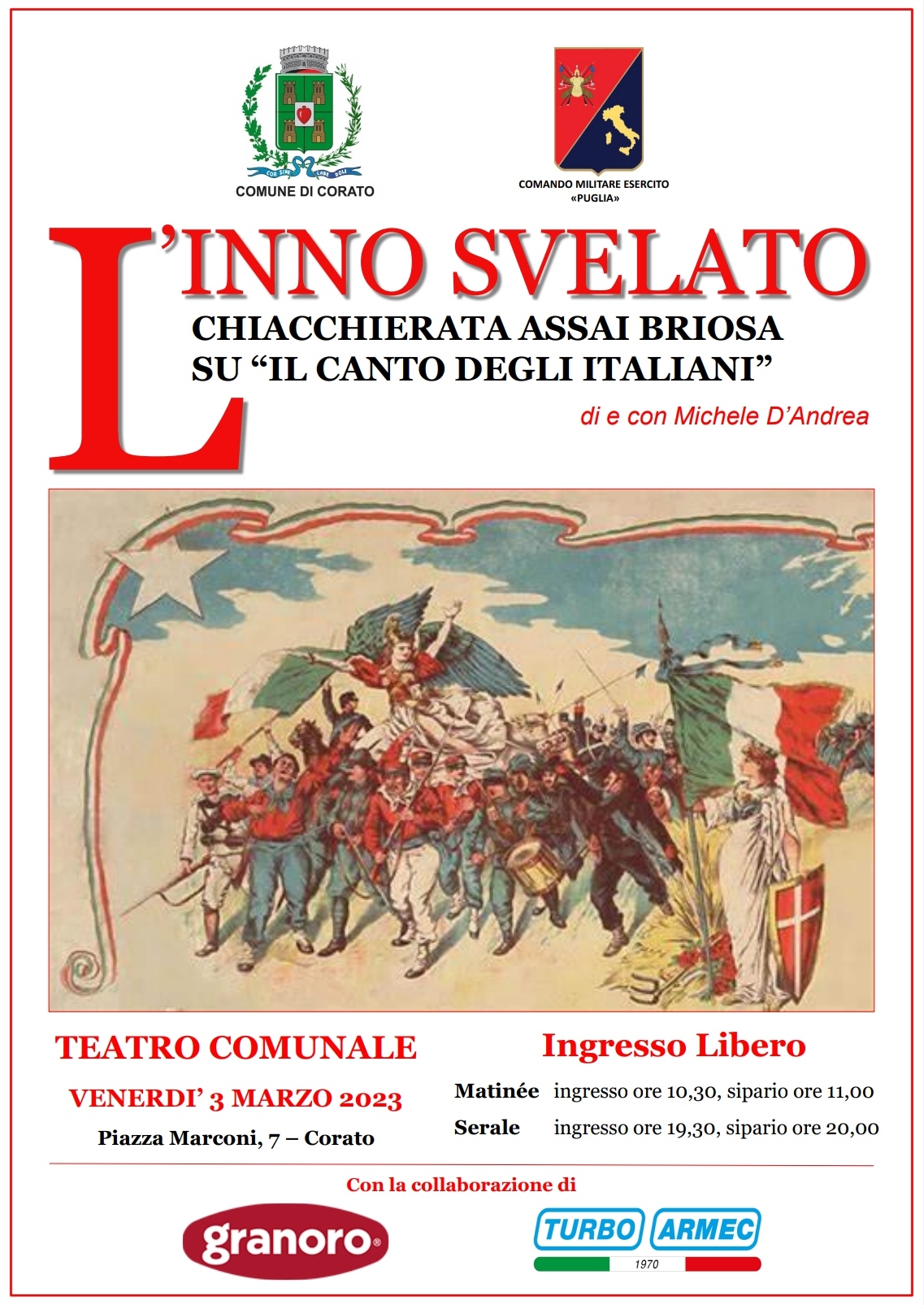 Venerdì 3 marzo, alle ore 20:30, il Comando Militare Esercito “PUGLIA” e il Comune di CORATO, organizzano, presso il Teatro Comunale, una lezione spettacolo intitolata “L’inno svelato- storia assai briosa sul canto degli italiani”.