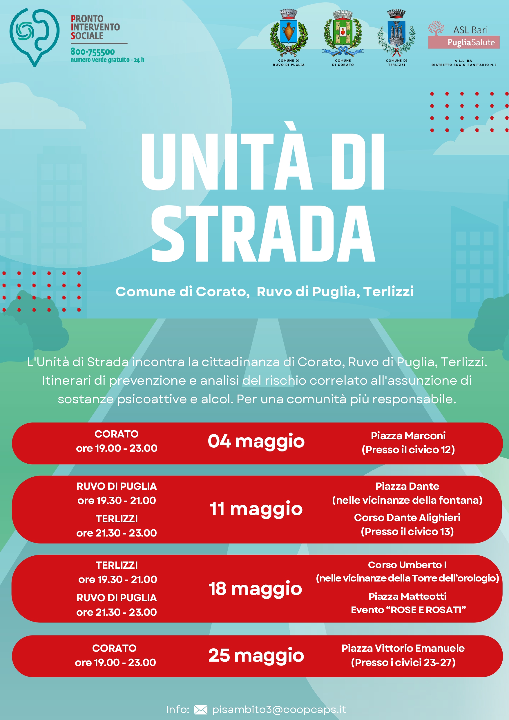 L’ Unità di Strada del Pronto Intervento Sociale (P.I.S.) dell’Ambito territoriale di Corato, Ruvo di Puglia e Terlizzi realizza anche attività di monitoraggio e sensibilizzazione on the road.