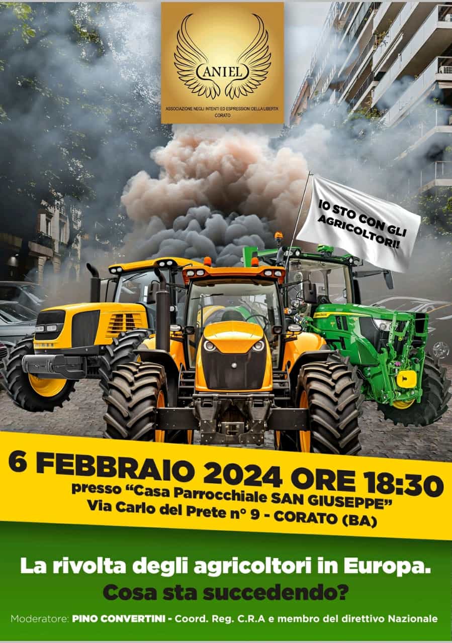 A tal proposito, oggi, martedì 6 febbraio, a partire dalle 18:00, nella casa parrocchiale San Giuseppe, in via Carlo del Prete a Corato, si terrà il convegno “La rivolta degli agricoltori in Europa”. L’evento è organizzato dall’associazione Aniel (Associazione negli intenti ed espressioni della libertà).