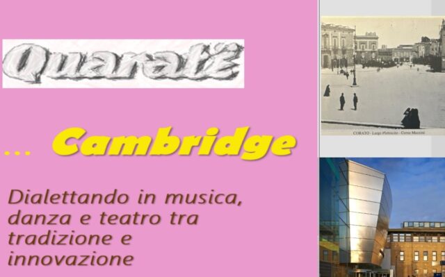 Il progetto “Da Quaratë… a Cambridge: dialettando in musica, danza e teatro tra tradizione e innovazione”, promosso dallo Sporting Club Corato, nasce con l’idea di intraprendere un viaggio culturale e artistico capace di unire due realtà apparentemente distanti, ma profondamente vicine nel vissuto e nei valori: Quaratë, paese dell’entroterra pugliese dalle radici agricole oggi aperto a nuove realtà commerciali, e Cambridge, storica città universitaria inglese, simbolo di cultura e innovazione.