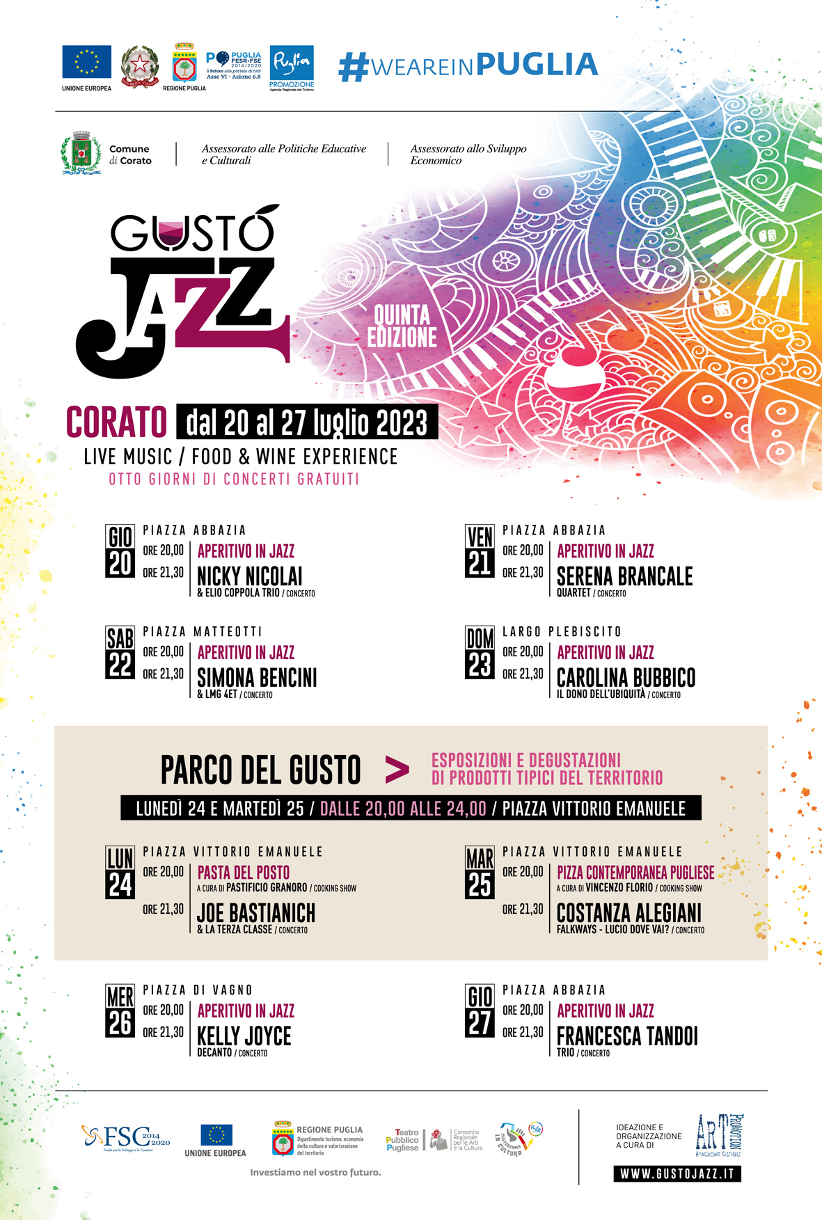 La V edizione del Festival GustoJazz, realizzato con il Patrocinio del Comune di Corato – Assessorato alle Politiche Educative e Culturali e Assessorato allo Sviluppo Economico, si svolgerà a Corato dal 20 al 27 luglio 2023.