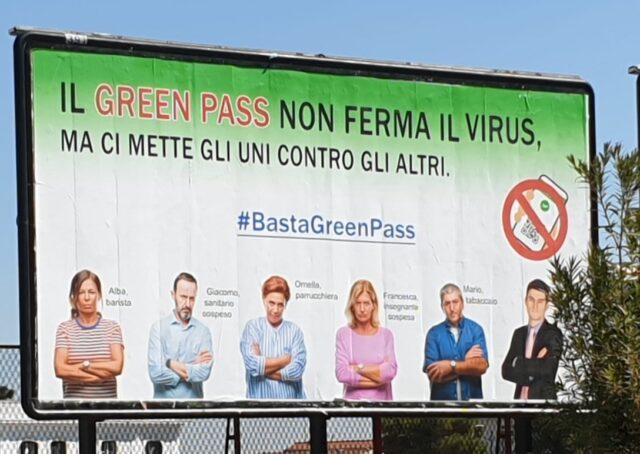 Come in altre città limitrofe, anche a Corato si può leggere l’ affermazione : “ IL GREEN PASS NON FERMA IL VIRUS, MA CI METTE GLI UNI CONTRO GLI ALTRI” su manifesti 6×3 che riportano anche foto simboliche di persone appartenenti a varie categorie professionali, alcune delle quali stanno vivendo sospensioni e perdita dal lavoro .