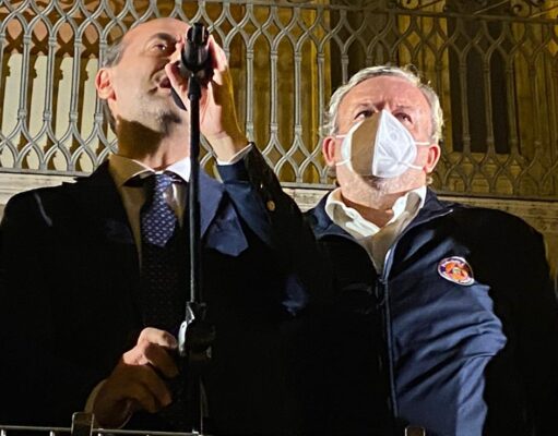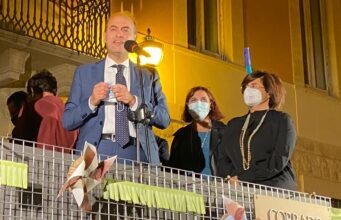 Sulle note di “Bella ciao” si apre il comizio di ringraziamento di De Benedittis, al suo fianco sul palco...