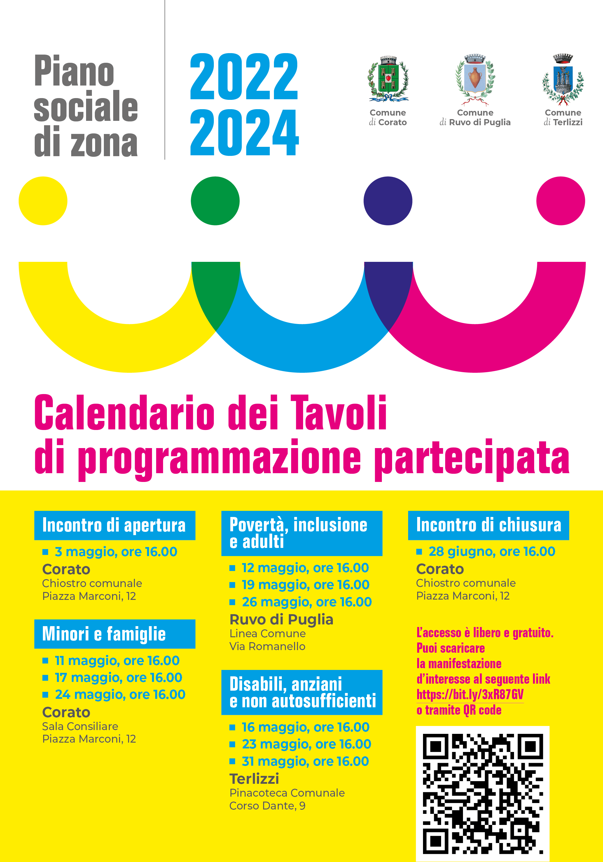 Domani, martedì 3 maggio, dalle ore 16.00 alle ore 19.00 presso il Chiostro del Comune di Corato, ci sarà l’Assemblea di apertura dei Tavoli di programmazione partecipata per la costruzione del nuovo Piano Sociale di Zona 2022-2024. Oltre ai referenti dell’Ufficio di Piano e al Direttore del Distretto Socio-Sanitario, interverranno i Sindaci e gli Assessori di Corato, Ruvo di Puglia e Terlizzi. Durante l’incontro ci sarà inoltre l’intervento dell’Assessora Regionale al Welfare Rosa Barone. Di seguito il programma dell’incontro: