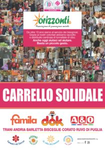 Alla base di questi concetti si genera una sintesi efficace pensata da chi ha sempre fatto della Solidarietà uno degli scopi principali della produttività imprenditoriale. Grazie alla collaborazione dell’Associazione Orizzonti con il Gruppo Megamark nasce il CARRELLO SOLIDALE, una spesa che “ogni giorno” i cittadini possono lasciare nel carrello per i fratelli bisognosi. Il progetto sarà attivo in tutti i supermercati Dok, A&O e Famila dei Comuni della Bat Andria, Barletta, Bisceglie, Trani e quelli baresi di Corato e Ruvo di Puglia.