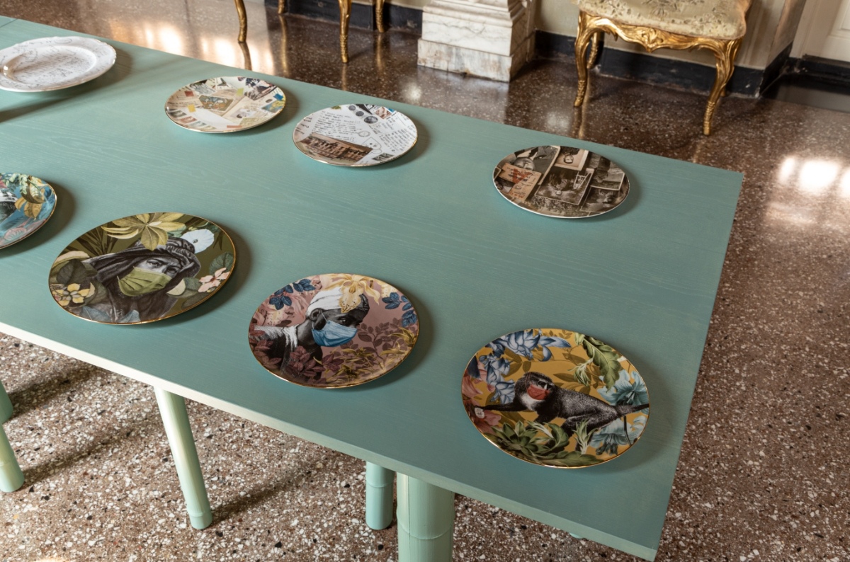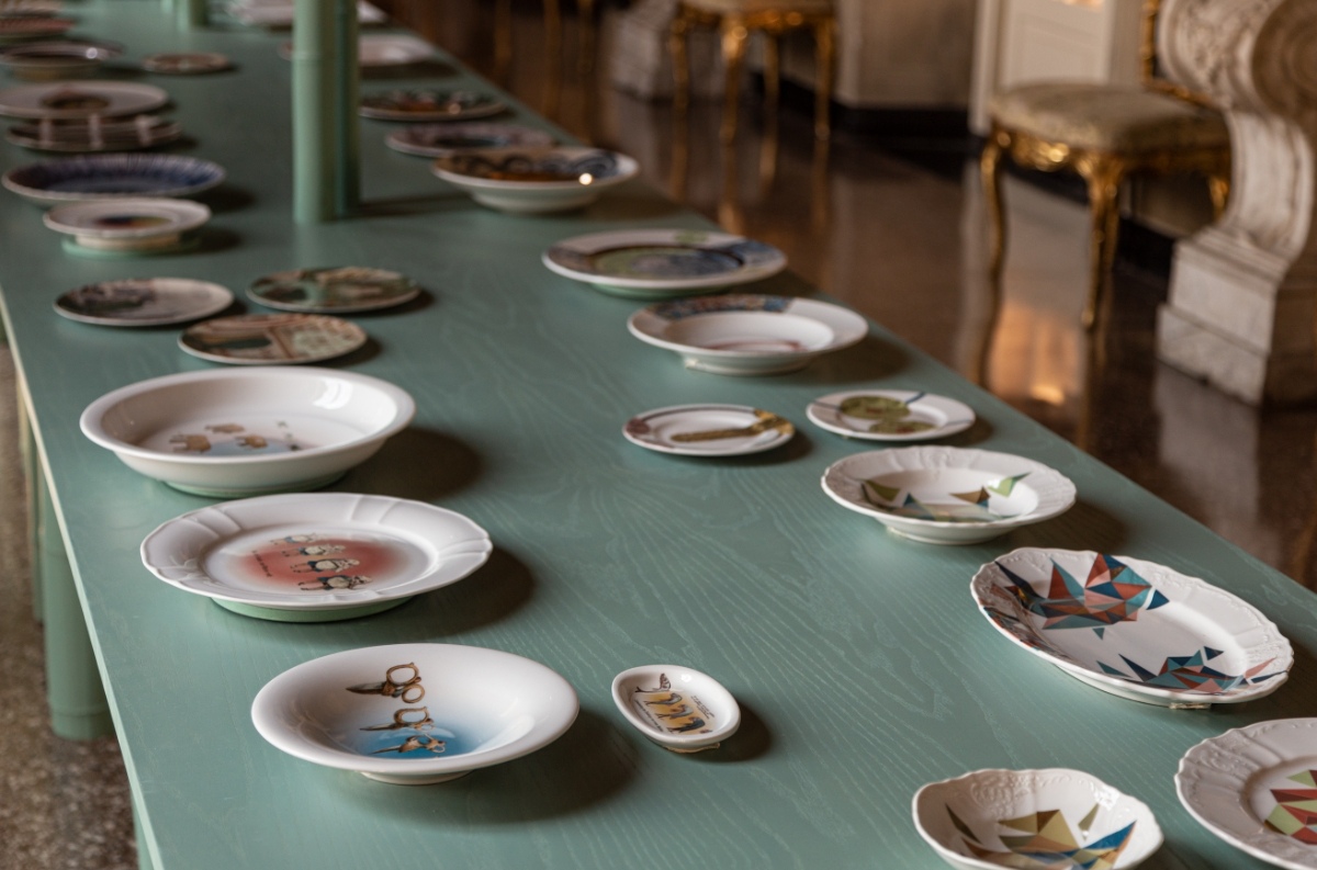 La prima modalità è installativa. Nella Galleria degli Specchi, un tavolo – che si fa metafora della tavola apparecchiata – raccoglie cento piatti creati nei sessantanove giorni di isolamento trascorsi in casa, usando la ceramica come le pagine di un diario.