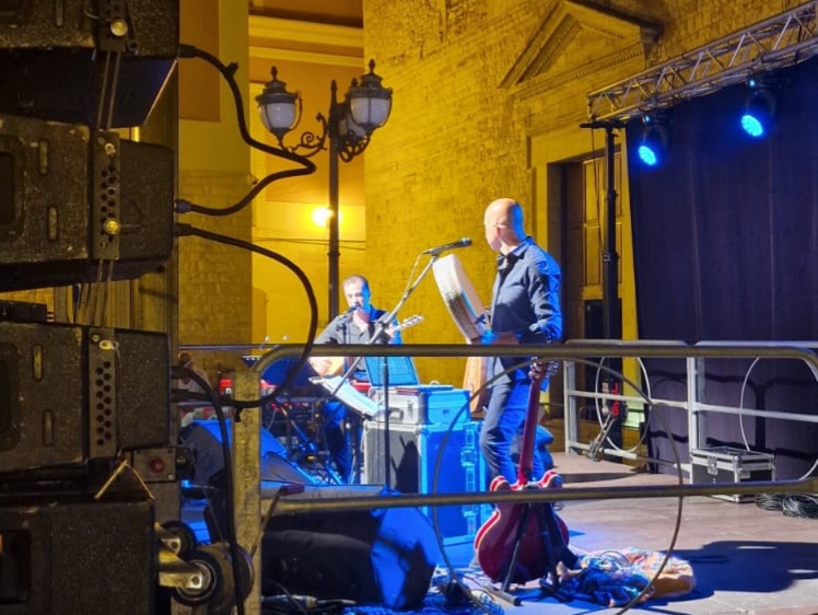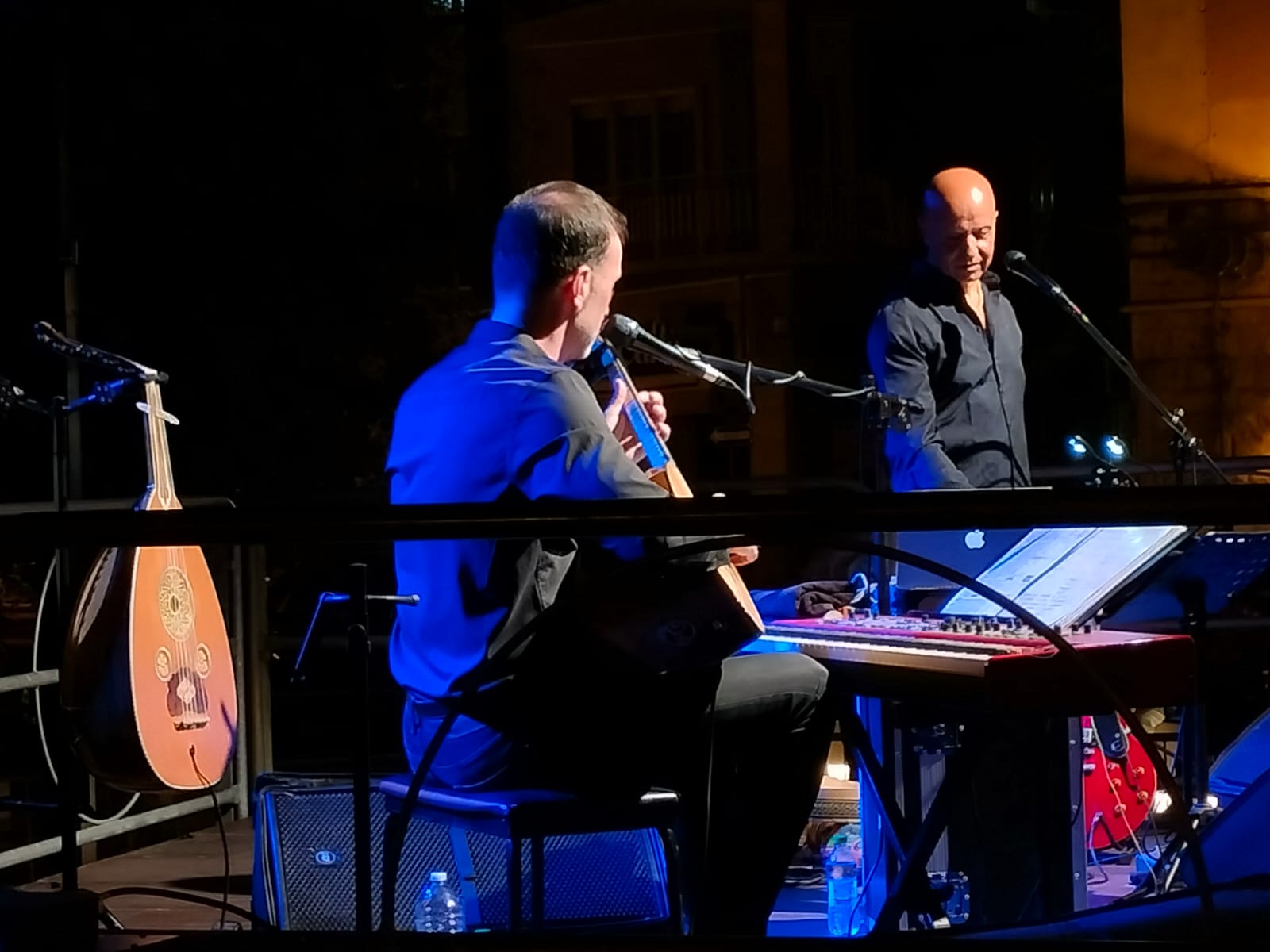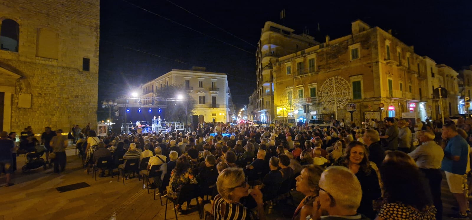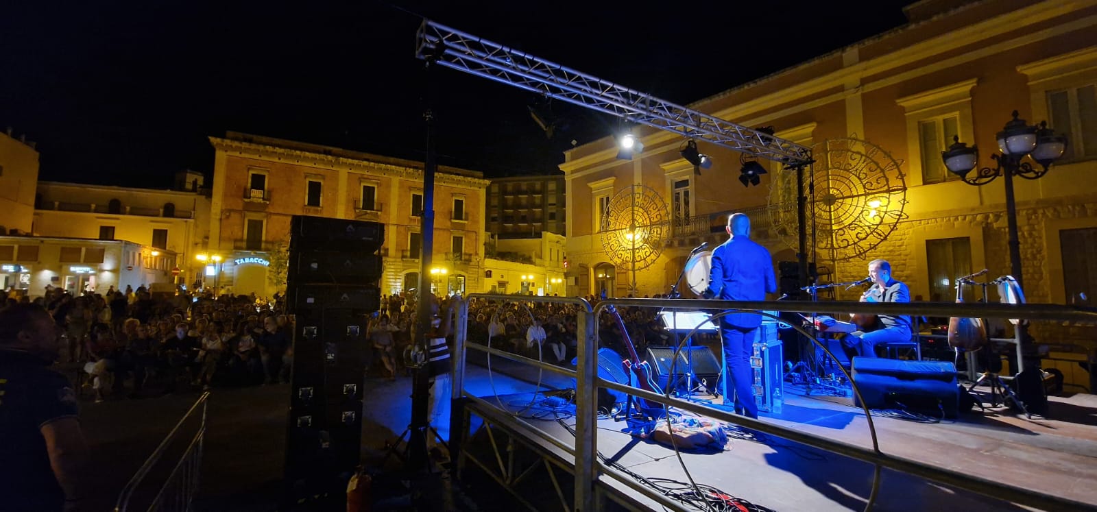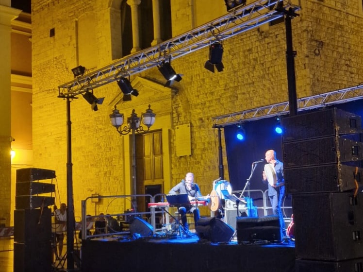 Il concerto Ghibli che venerdì 26 ha avuto luogo in Piazza Cesare Battisti, introdotto dalle parole del presidente Pro Loco Gerardo Strippoli e dal Sindaco Corrado De Benedittis, è stato dettato dalla scelta di forme di espressioni artistiche molteplici: i suoni del Mediterraneo sono auspicio di pace, libertà e speranza. Ghibli ( il vento del Sahara)- Suoni ed Echi dal Mediterraneo con Nabil Bey e Fabrizio Piepoli: due delle voci più importanti della world music italiana e del pop di matrice mediterranea: il libanese di origini palestinesi Nabil Bey (voce dei #Radiodervish, collaboratore di Battiato e altri) e il pugliese Fabrizio Piepoli (voce de La Cantiga de la Serena e già collaboratore di Teresa De Sio e altri) hanno unito gli universi musicali pugliese e arabo-mediorientale, mescolando tradizione e musica leggera, mettendone in luce gli aspetti storici, culturali, teorico-musicali mescolando suoni acustici ed elettronica. Il pubblico è rimasto incantato dai suoni dei due musicisti che hanno inteso mettere al centro del loro messaggio musicale la dignità dell’uomo, spesso in balia della guerra, delle prossime condizioni di vita che li portano a lasciare la loro terra per un futuro migliore, sempre con il forte desiderio di tornare a casa.