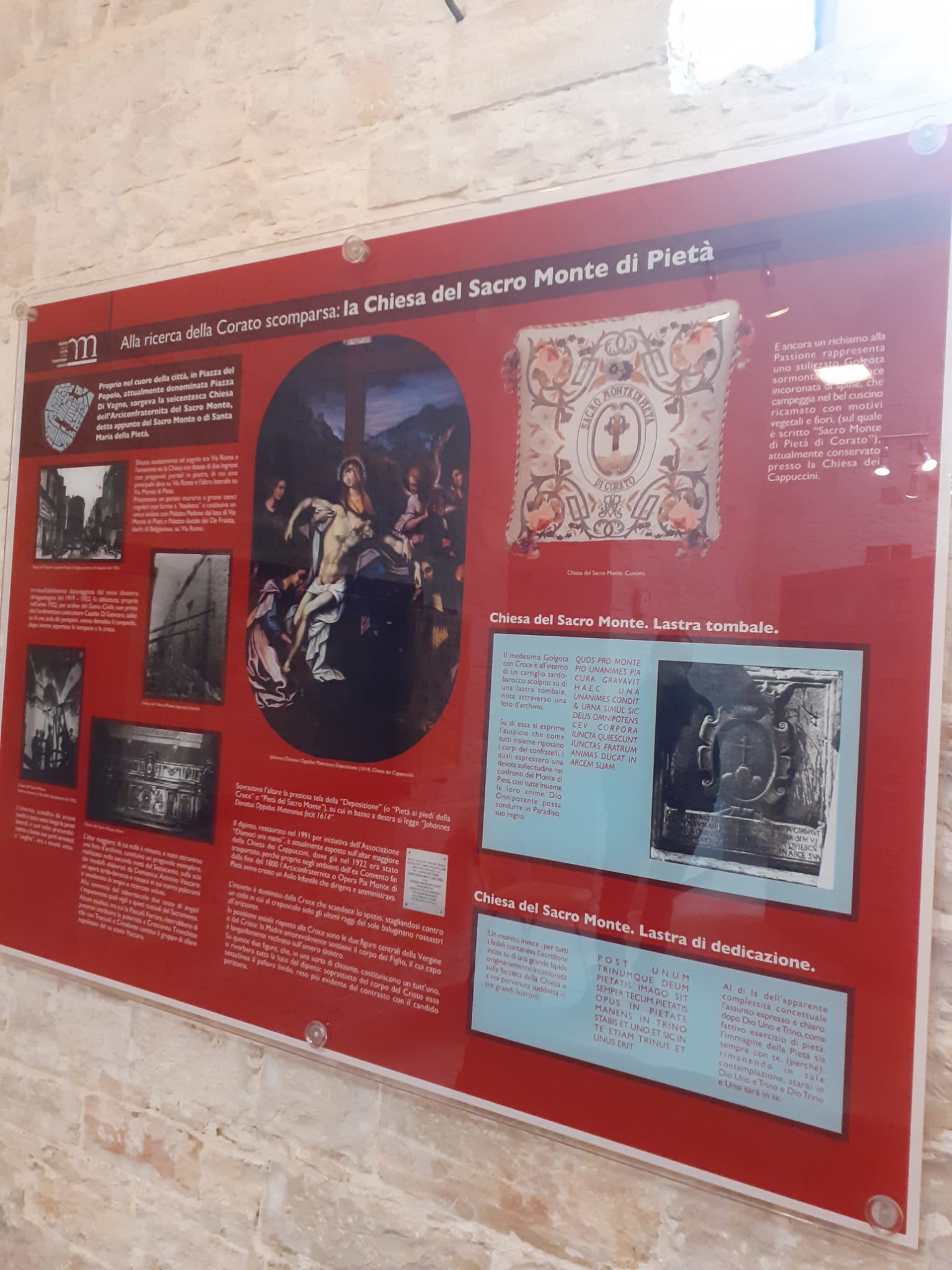 L’itinerario proseguirà nella Sala 1922 del Museo della Città e del Territorio, che custodisce il materiale lapideo rinveniente dai crolli del 1922, e si concluderà nella Chiesa dei Cappuccini, fulcro dell’ex complesso conventuale, fra i più antichi esistenti su Corato, per conoscere la Pala d’altare della “Pietà”, prezioso manufatto di Giovanni Donato Oppido Materano, unico manufatto salvato dalla demolizione della Chiesa del Sacro Monte di Pietà.