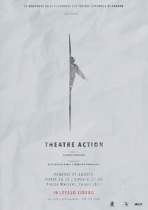 THEATRE ACTION è un progetto voluto, pensato e ideato dalle maschere e dal personale del Teatro Comunale per riaprire “simbolicamente” il Teatro/teatri d’Italia e per ritornare ad un assembramento culturale. Un’azione di arte pubblica e arte sociale che si terrà venerdì 21 agosto, porta 20:30, sipario 21:00, presso Piazza Marconi a Corato, un progetto promosso dal Teatro dei Borgia e patrocinato dal Comune di Corato