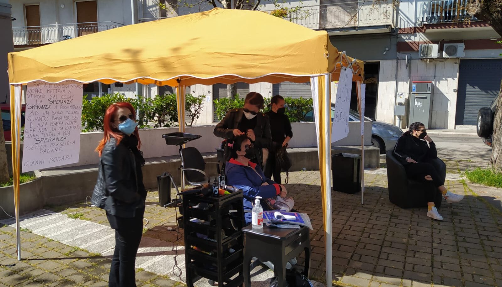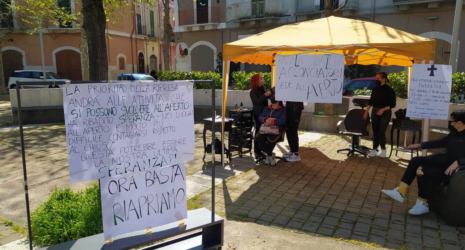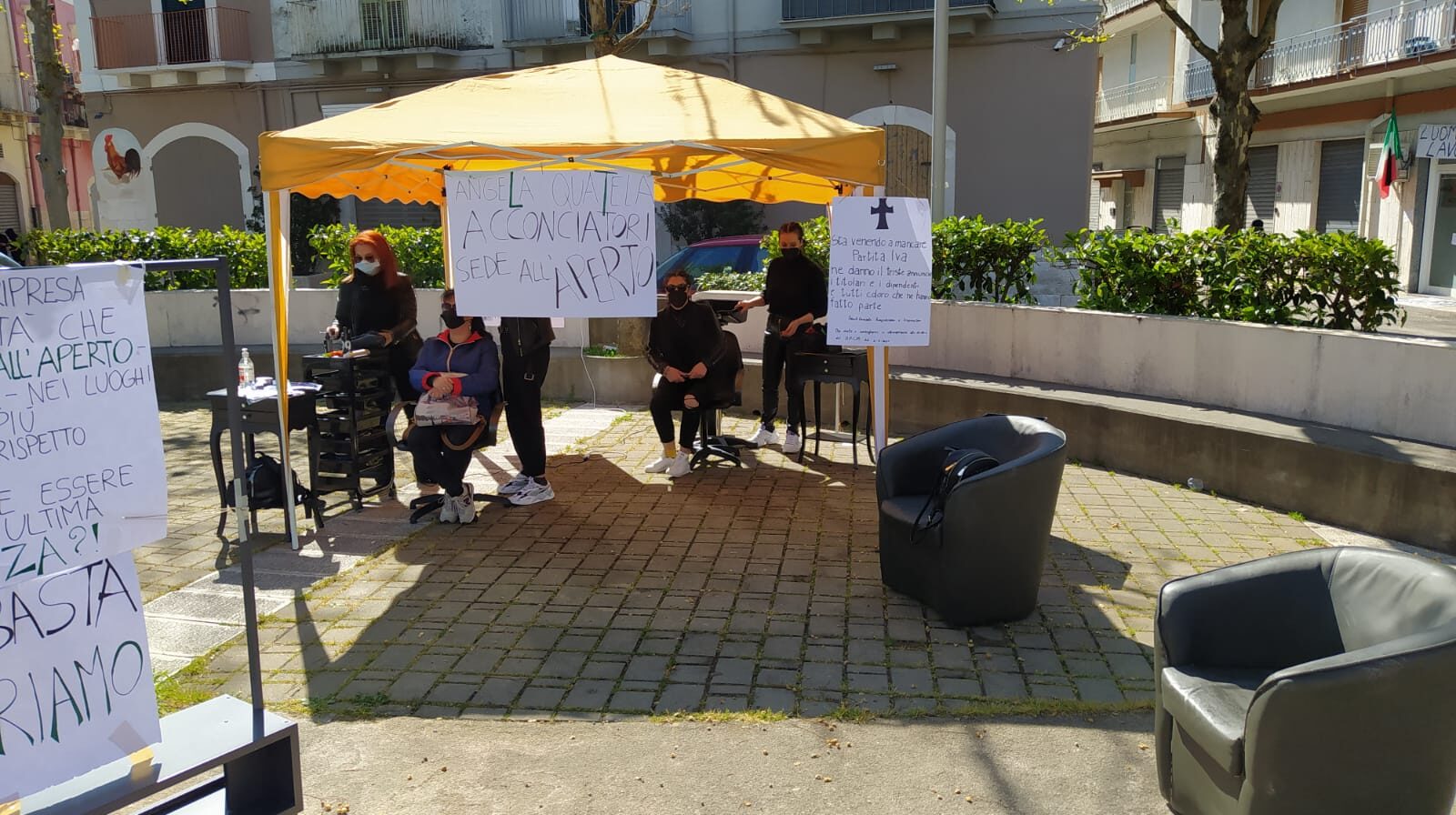 E così, questa mattina, presto allestito nella piazza antistante il suo negozio un salone con tanto di insegna: “Angela Quatela acconciatori sede all’aperto”.