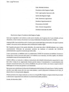 Il Senatore Perrone denuncia in una nota inviata al Presidente della Regione la carenza di personale e attrezzature dedicati al contenimento della pandemia nonché all’assessore alla Sanità Lopalco, al Dir. dipartimentale di Prevenzione ASL Bari e al Dir. generale ASL Bari.