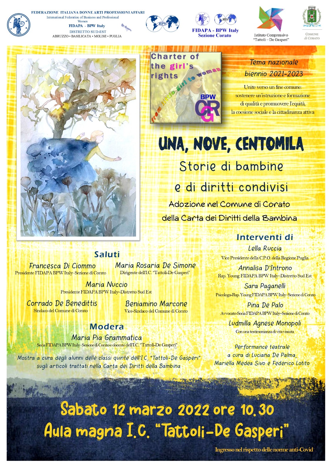 Sabato 12 marzo l’adesione del Comune di Corato alla Carta dei Diritti della Bambina promossa dalla FIDAPA BPW Italy – Sezione di Corato