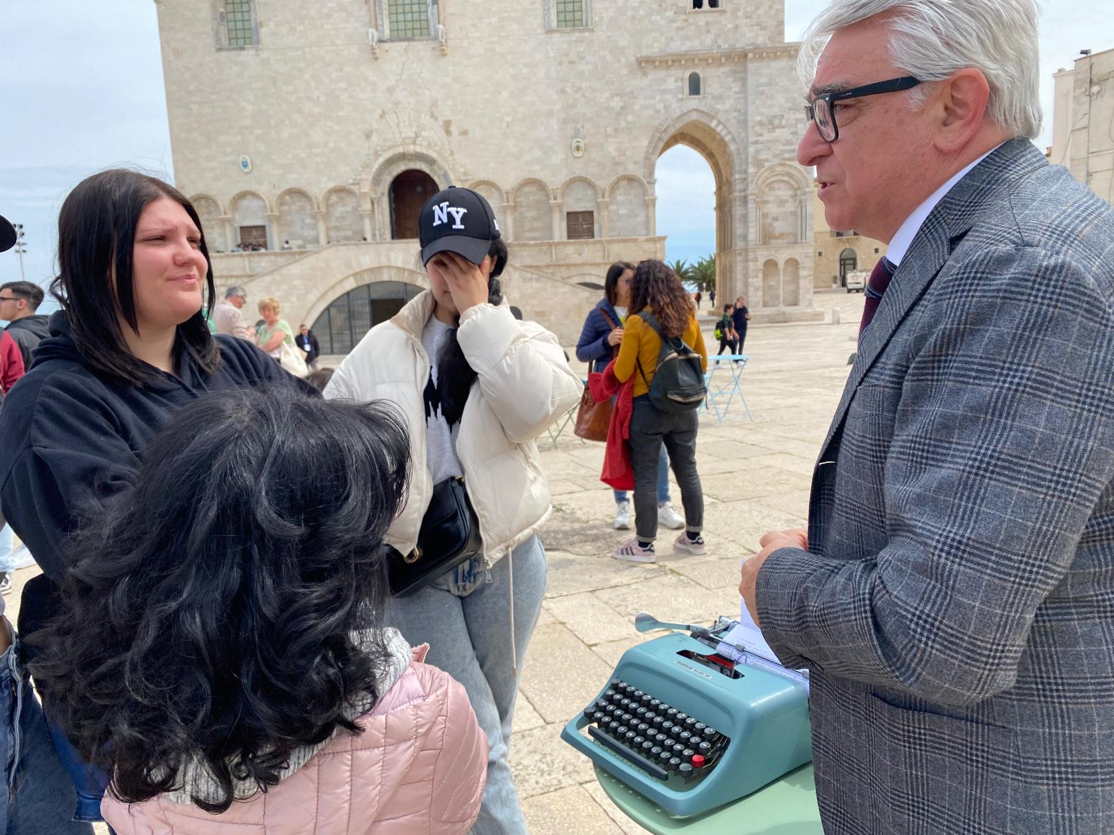 Grande successo e grande partecipazione al Flash Mob “Scritti alla luce del sole” in piazza Duomo a Trani, organizzato per l’ottavo anniversario della Fondazione S.E.C.A., dell’apertura del Museo della Macchina per Scrivere, vero e proprio magnete del Polo Museale Diocesano, ospitato nelle sale di Palazzo Lodispoto.