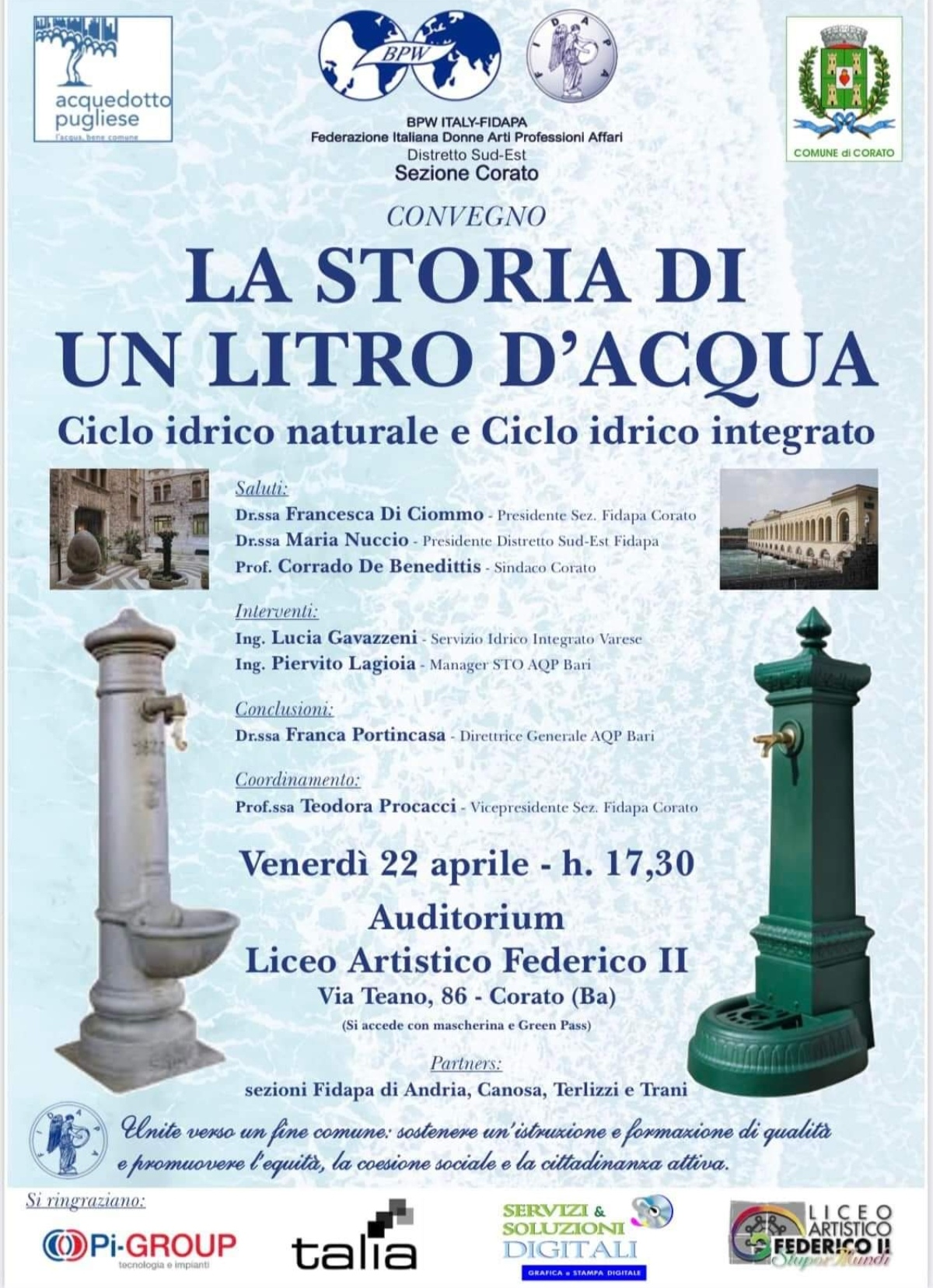 “LA storia di un litro d’acqua”, ciclo idrico naturale e ciclo idrico integrato è il tema al centro di un convegno organizzato e gestito dalla sezione FIDAPA di Corato, nelle persone della Presidente Francesca Di Ciommo e della Vicepresidente Teodora Procacci, coadiuvate da un gruppo di socie con la partecipazione delle sezioni Fidapa di Andria, Canosa, Terlizzi, Trani.