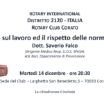 Il 14 dicembre p.v. alle ore 20:30, presso la sede del Club Rotary di Corato (Larghetto San Benedetto, 5), dopo i saluti del Presidente Geom. Pasquale Tarricone, si parlerà, con il dr. Saverio Falco – dirigente medico Resp. U.O.S. SPeSAL Area Nord – Dipartimento di Prevenzione ASL BA, di infortunio sul lavoro e delle norme vigenti in materia.