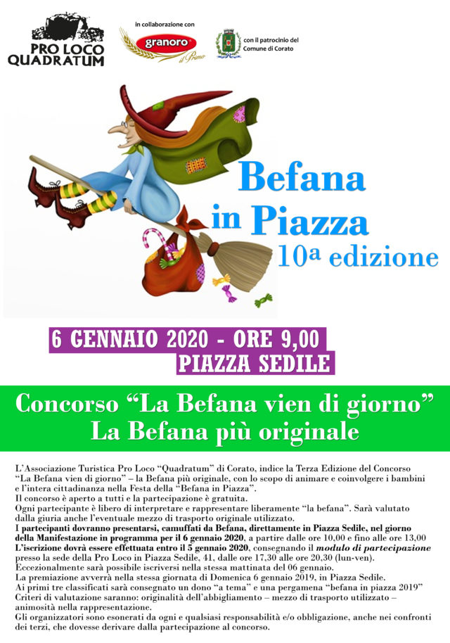 L‘Associazione Turistica Pro Loco “Quadratum” di Corato è lieta di presentare la 10a edizione della “Befana in Piazza”, in cui grandi e piccoli potranno Lunedì 6 gennaio 2020 in Piazza Sedile dalle ore 09.00 salutare la vecchina più famosa d’Italia e ricevere dolci sorprese.
