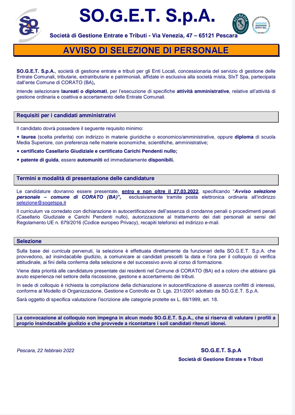 La nostra testata nel dare visibilità alla ricerca di personale si chiede però come mai occasioni come questa (l’avviso è datato il 22 febbraio 2022 e scadrà il prossimo 27 marzo) non siano ampiamente divulgate e rese note tempestivamente alla stampa. L’avviso è infatti unicamente consultabile accedendo al sito istituzionale della SOGET spa all’interno della sezione news.