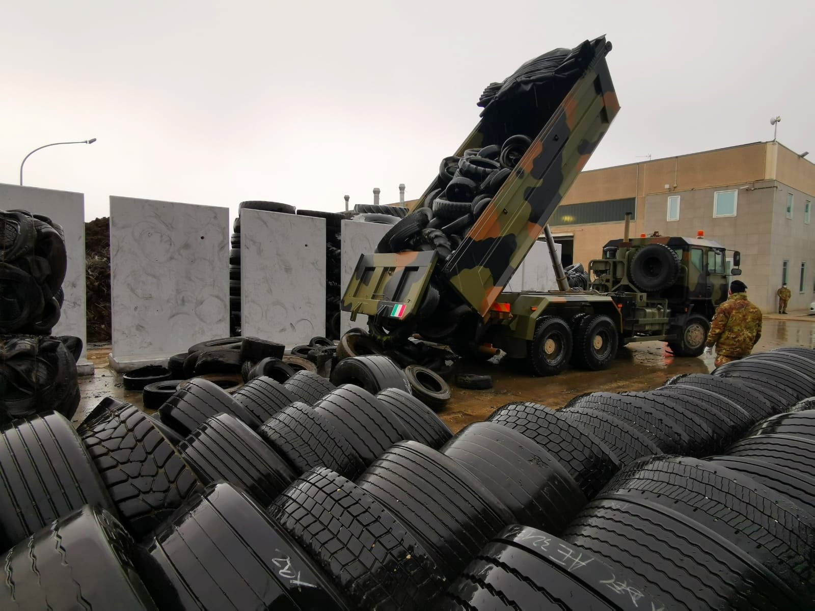 L’intervento dell’Esercito, inserito nell’ambito di un’esercitazione, ha permesso di recuperare circa 40mila kg di pneumatici trasportati su otto camion. I PFU raccolti sono stati smaltiti nell’impianto “Corgom” la cui filosofia sposa i principi virtuosi dell’economia circolare, ottenendo materie prime seconde da utilizzare per produrre materiali nuovi. La gomma riciclata ricavata dai PFU può essere reimpiegata per costruire campi da calcio, asfalti modificati e aree gioco per bambini.