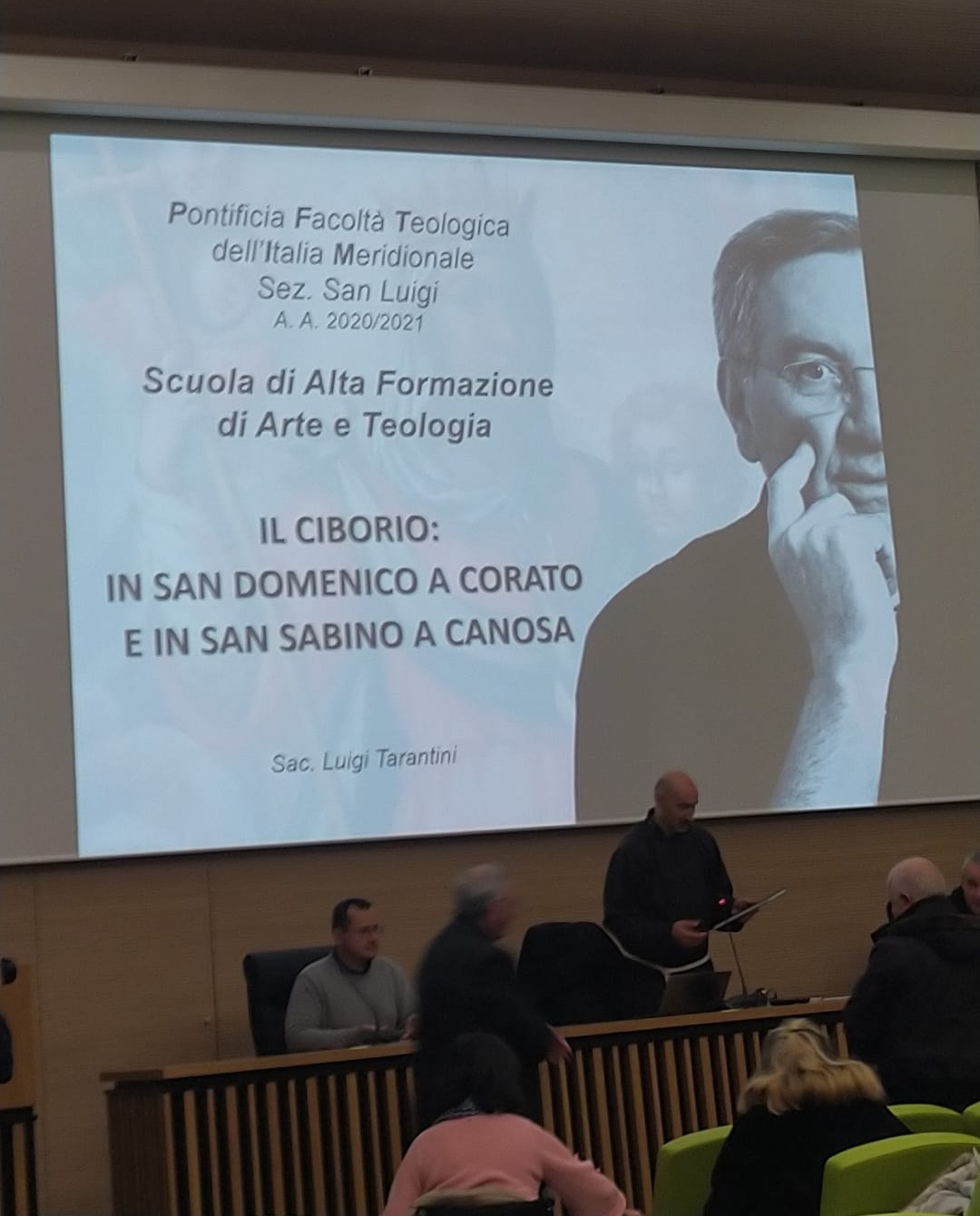 Nell’aula magna della Pontificia Facoltà Teologica dell’Italia Meridionale – sezione San Luigi – Scuola di Alta Formazione di Arte e Teologia, sulla meravigliosa collina di Posillipo, don Gino ha discusso la tesi “Il ciborio in San Domenico a Corato e in San Sabino a Canosa“ alla presenza del presidente di Commissione prof. Salato, del relatore prof. Gambuti e del correlatore prof. Ernandez.