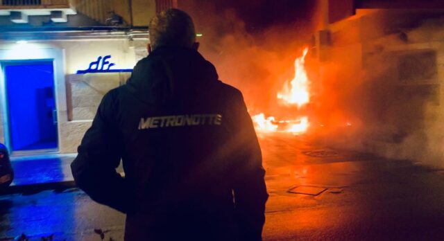 A prendere fuoco è stata una Fiat Punto, un veicolo di servizio di vigilanza e protezione civile delle Guardie per l’Ambiente in utilizzo al Presidente Pasquale Laterza che scrive sui social: