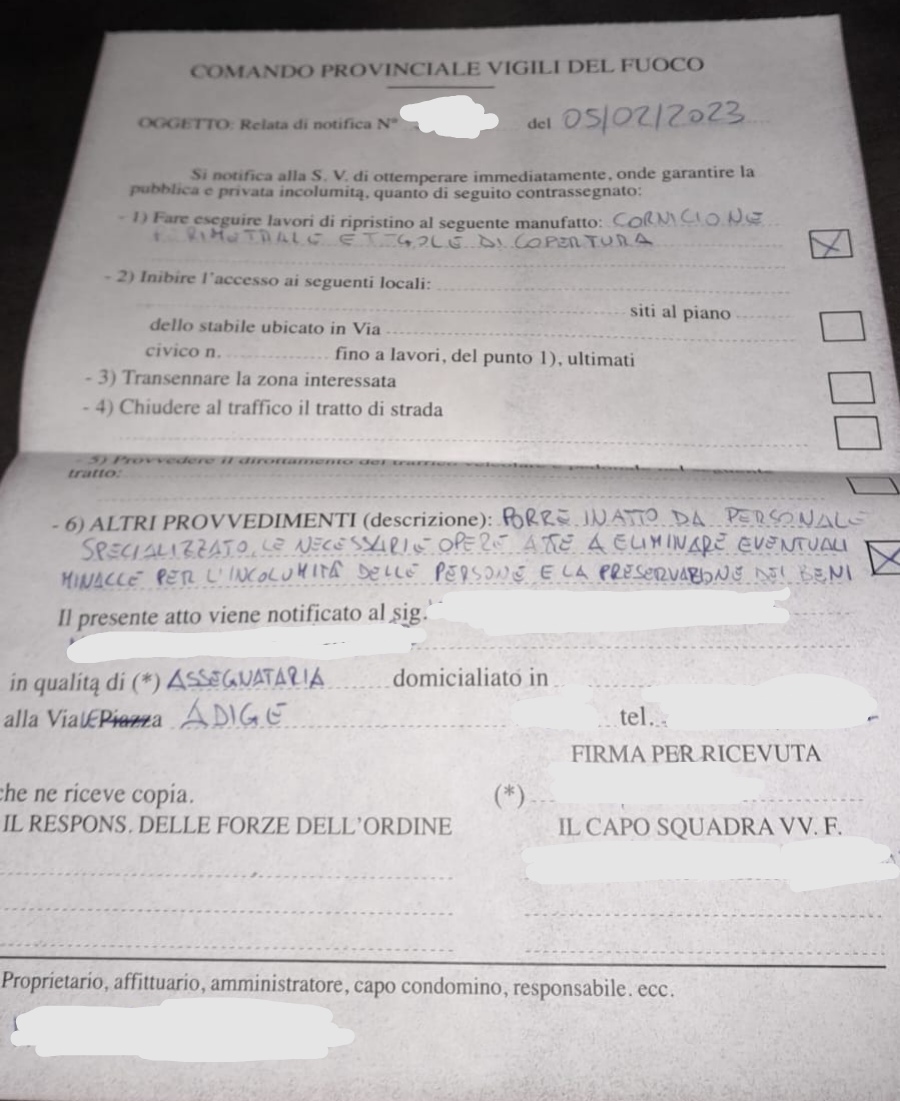 Anche ieri mattina, probabilmente anche a causa del forte vento, l’episodio si è reiterato, spaventando i condomini che hanno istantaneamente allertato i Vigili del Fuoco che giunti sul posto, hanno provveduto a rimuovere alcune parti del cornicione. La situazione non va assolutamente trascurata e urge un celere intervento, come si evince nello spazio “altri provvedimenti” del verbale redatto dagli stessi vigili: “Porre in atto da personale specializzato le necessarie opere atte ad eliminare eventuali minacce per l’incolumità delle persone e la preservazione dei beni”.