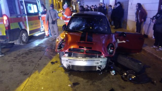 Scontro tra una Mini Cooper guidata da un giovane intorno ai trent’anni e una Lancia Musa con a bordo un uomo e una donna.