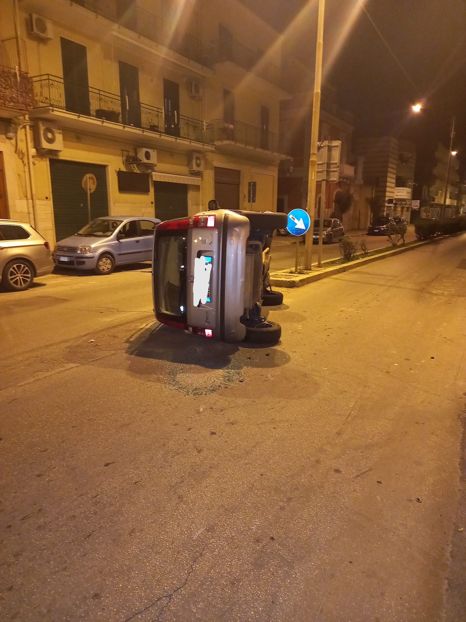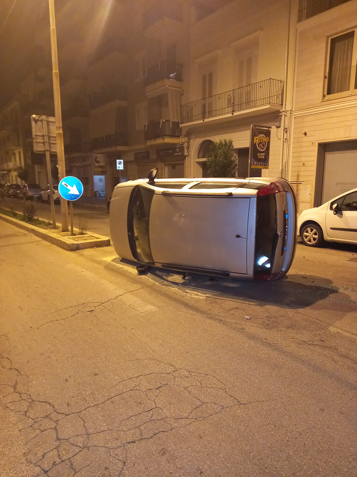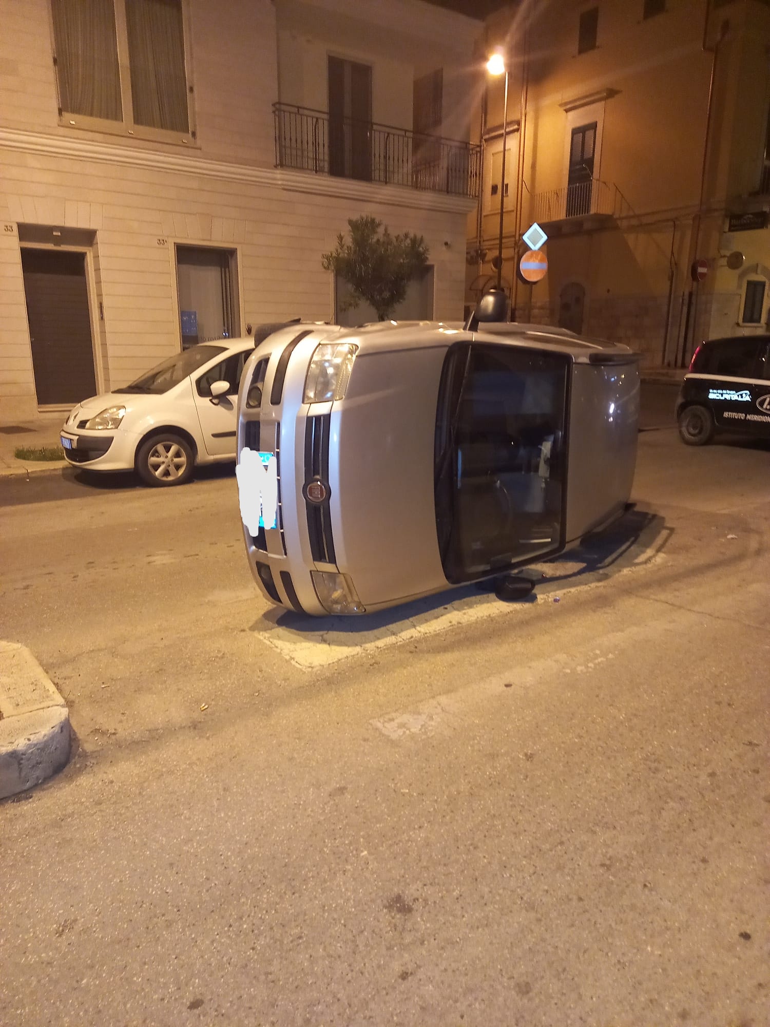 In viale Vittorio Veneto, angolo via San Vito, una Fiat Panda, si è ribaltata su un fianco.