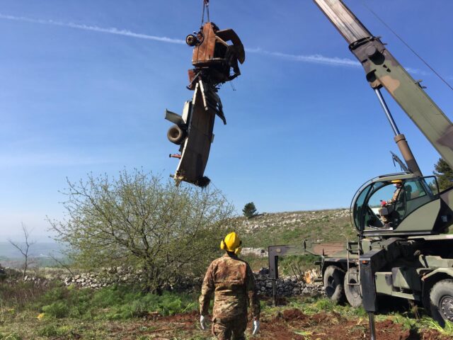 Così il presidente del Parco Francesco Tarantini sull’importante attività di rimozione di un veicolo Fiat Iveco, svolta questa mattina dall’11° Reggimento Genio Guastatori della Brigata “Pinerolo”. La carcassa si trovava in una delle Cave di Bauxite a Spinazzola, in una zona impervia e difficilmente raggiungibile.