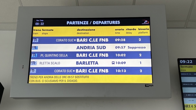 In data odierna, il treno delle ore 07.44 da Corato Sud, diretto a Bari Centrale via Palese Macchie, ha accumulato un ritardo di circa 60 minuti a causa dell’ennesimo guasto al passaggio a livello di Terlizzi, di una sosta forzata di 20 minuti nella stazione di Ruvo, ulteriori 30 minuti di fermo a Palese e altri 10 a Fesca S. Girolamo.