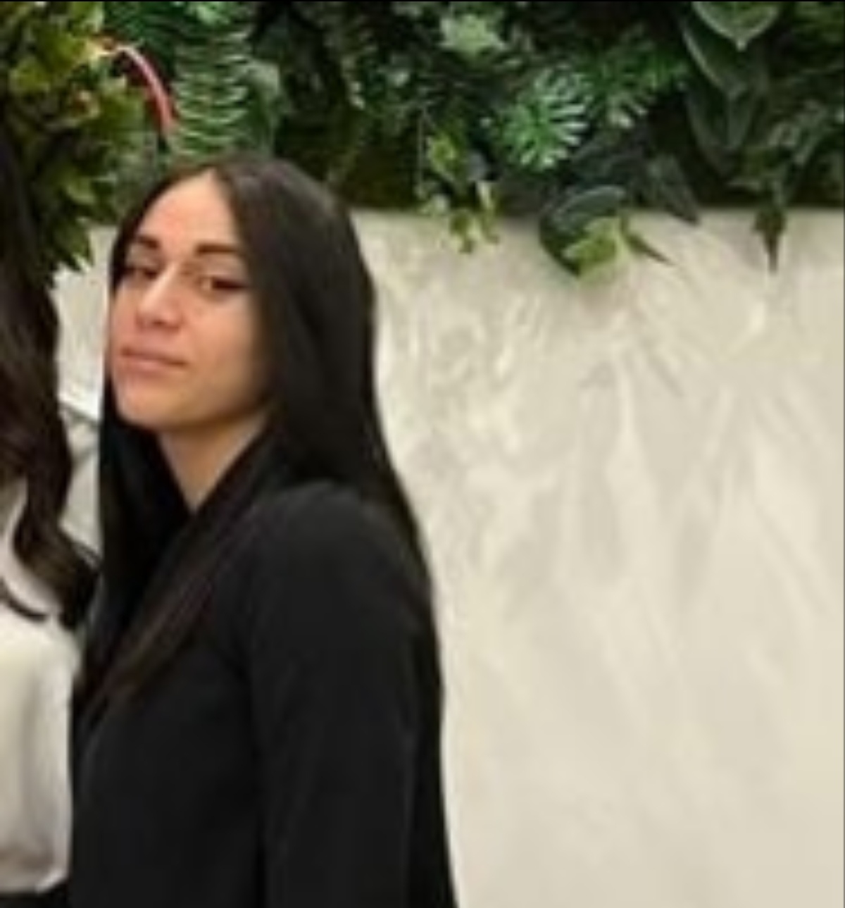 Desirée indossa una tuta nera, le maniche della giacca ha delle strisce bianche, ha scarpe Nike bianche e una tracollina nera. È alta circa1,58.
