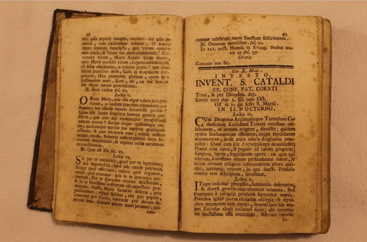 In particolare, ha analizzato due volumi settecenteschi a stampa, guida per officianti e fedeli alla liturgia in onore del Santo, patrono di Corato dal 1681.