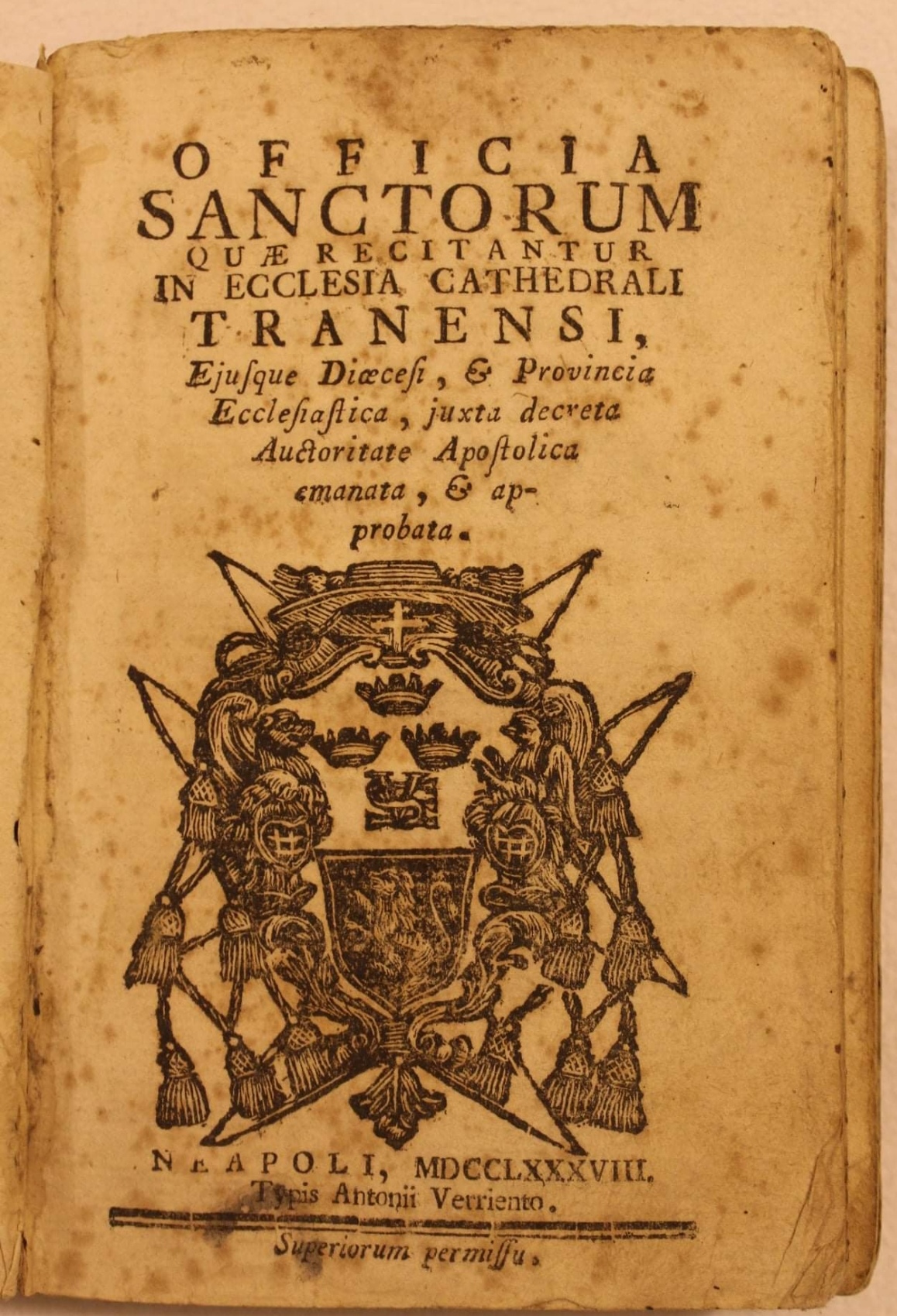 Il secondo volume, stampato come il precedente a Napoli nella tipografia di Antonio Varriento, si apre con lo stemma del vescovo tranese Gaetano Maria Capece che, sontuosamente, certifica la stampa del testo. Esso presenta la struttura dell’ Officia propria , attinente alla Liturgia delle Ore, e raccoglie gli Uffici dei Santi venerati nella diocesi di Trani secondo l’ordine cronologico.