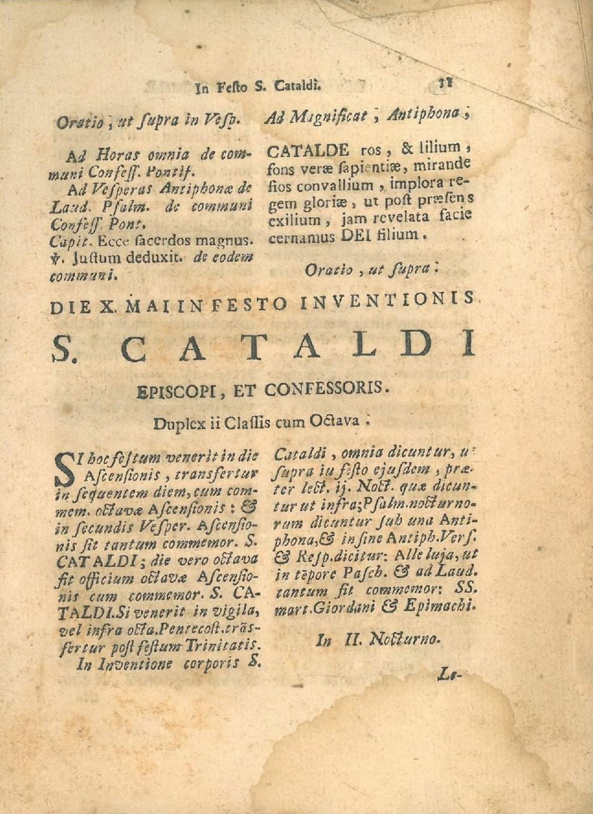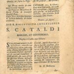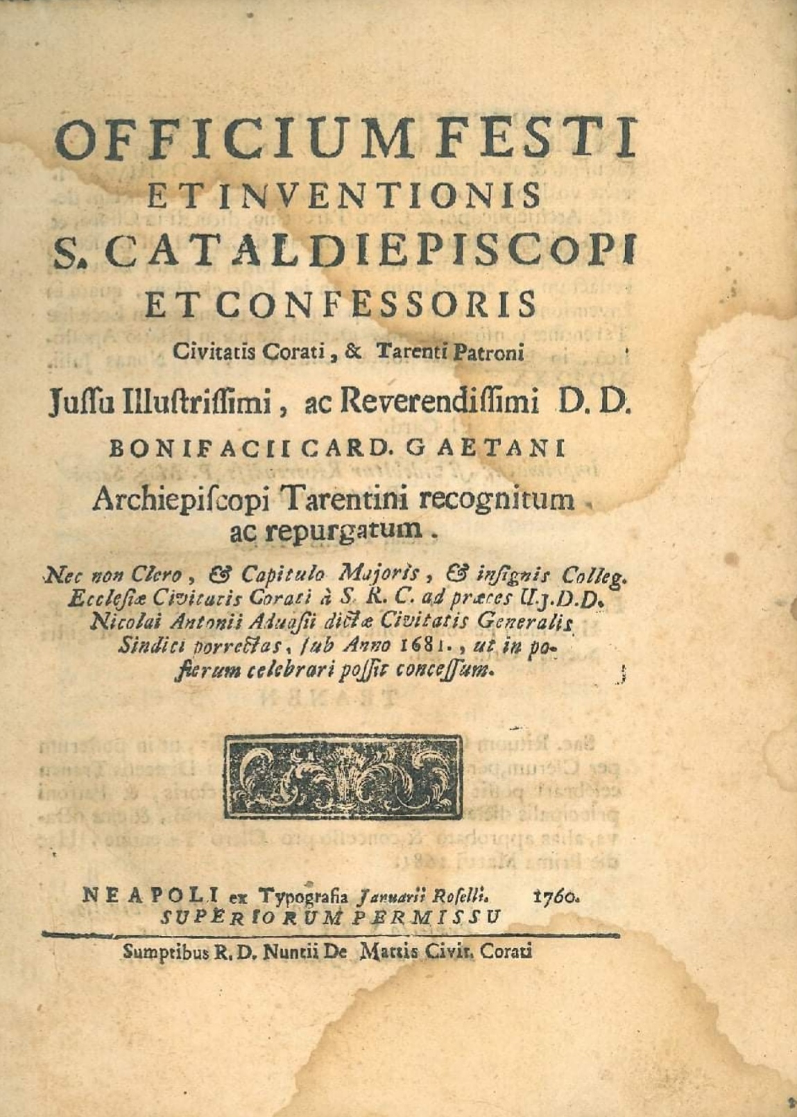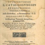 L’ Officium festi et inventionis S. Cataldi, corretto e ripurgato dal cardinale Bonifacio Caetani, arcivescovo di Taranto tra il 1613 e il 1617, aveva ottenuto la “licenza di stampa” nel 1681 dalla Sacra Congregazione dei Riti a firma di Cesare Facchinetti (1679-1683).