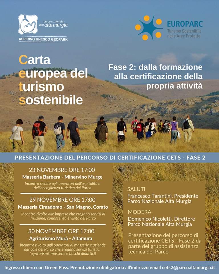 Martedì 23 novembre prende il via un importante ciclo di incontri per presentare la fase 2 del marchio #CETS, per informare gli operatori di strutture ricettive, agriturismi, masserie e servizi di guida turistica sulla possibilità di certificare la propria attività con la Carta Europea del Turismo Sostenibile, attraverso azioni che favoriscono la sostenibilità ambientale.
