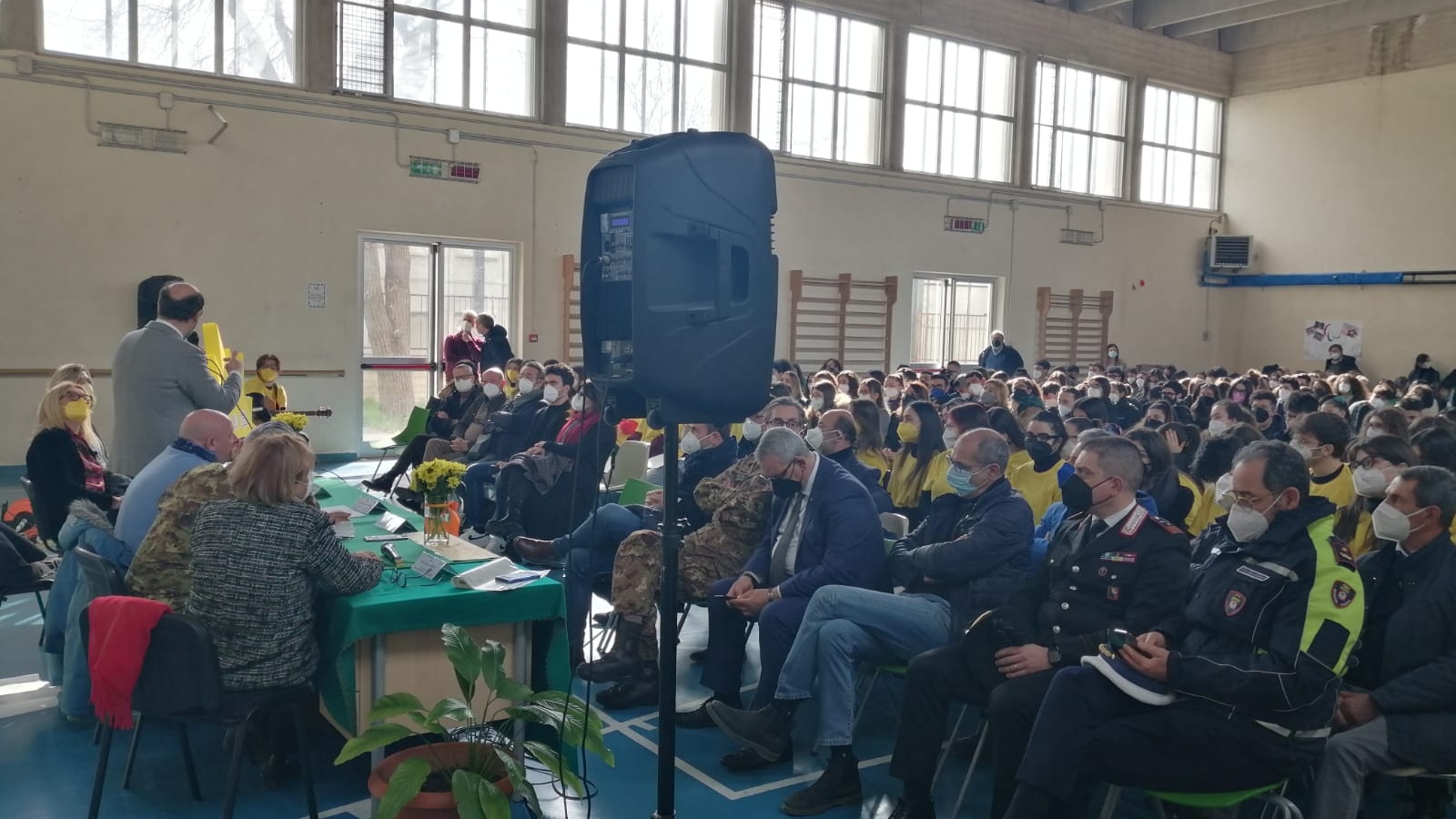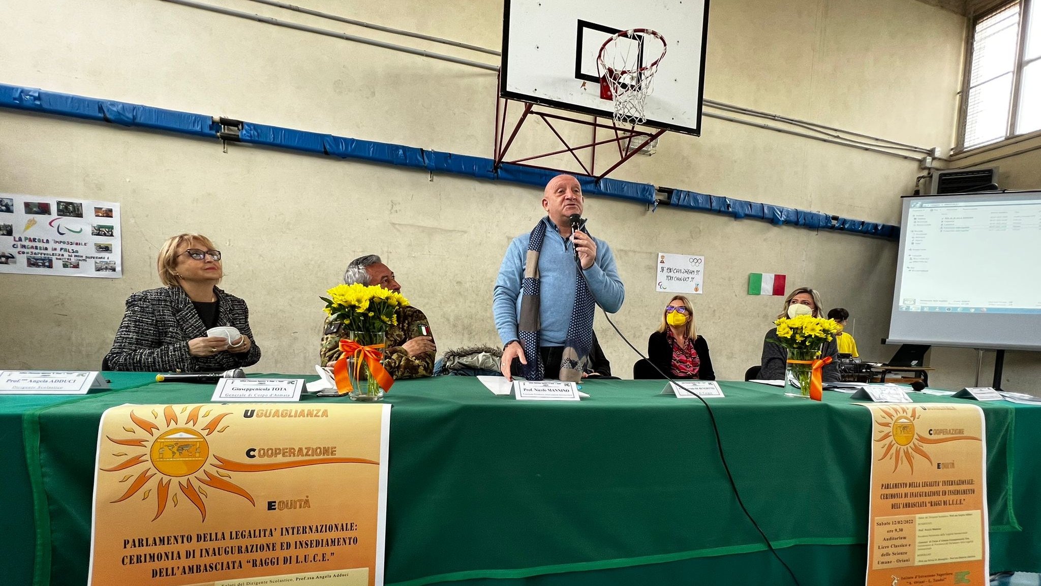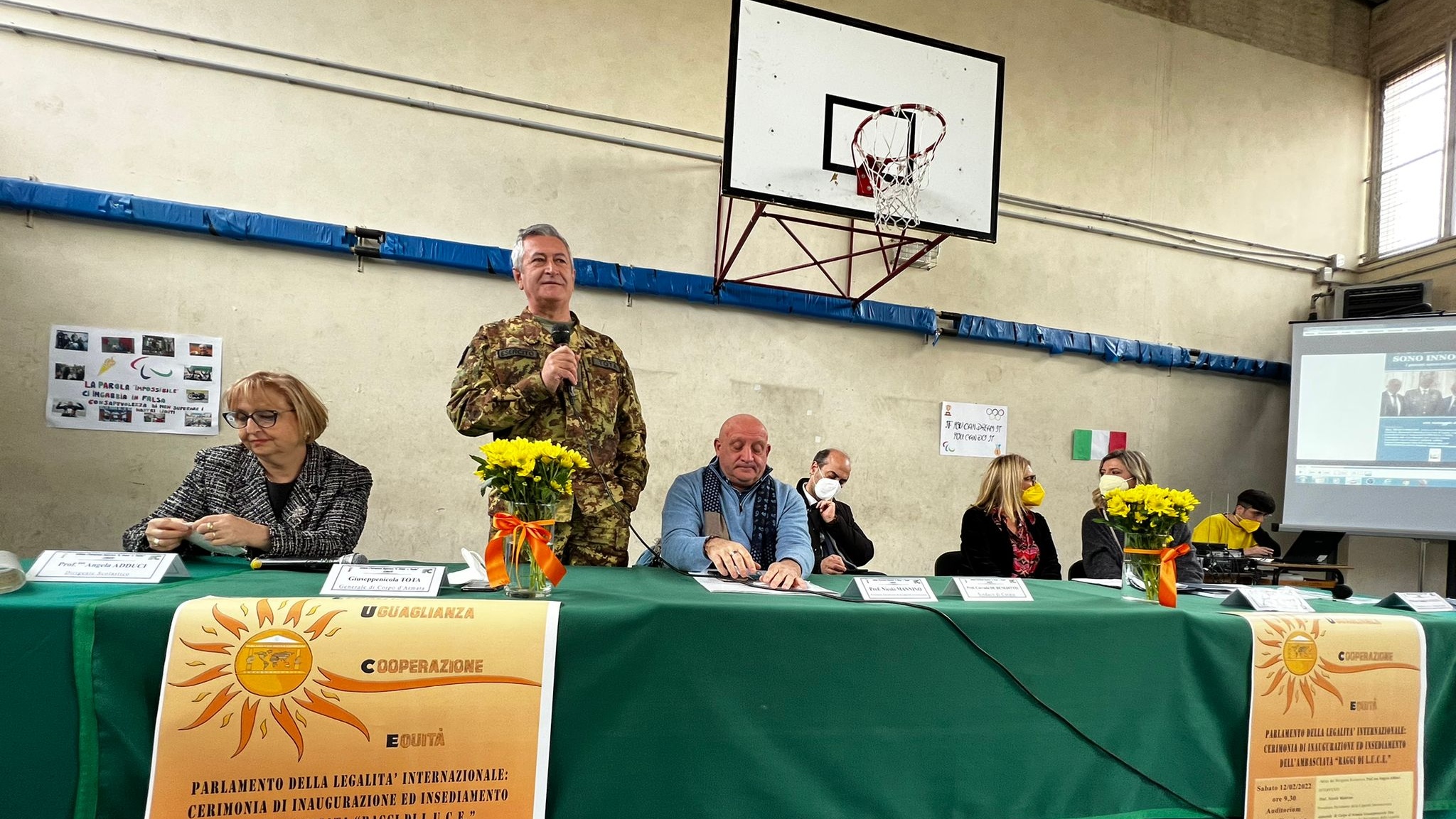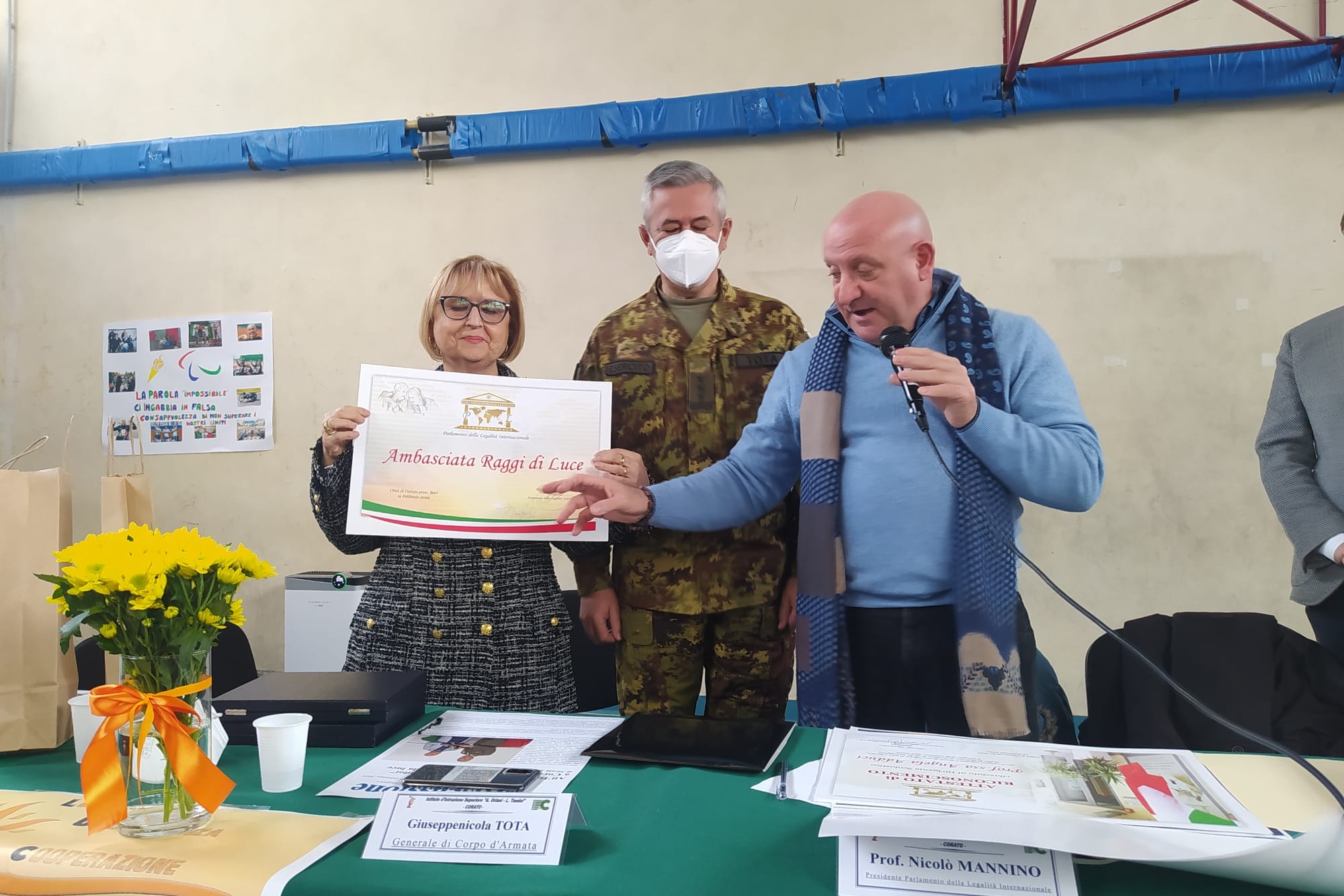 Ospiti dell’intensa e partecipata mattinata, ricca di spunti di riflessione, sono stati il prof. Nicolò Mannino, presidente del Parlamento Internazionale della Legalità, un movimento culturale apartitico di forte ispirazione cristiana, e il generale di Corpo d’Armata Giuseppenicola TOTA, comandante dell’Esercito Italiano Sud, che con le loro preziose testimonianze di impegno civile finalizzato alla diffusione del messaggio di legalità, hanno affascinato la platea di ragazzi presenti nella palestra, dove le consuete ore di “educazione fisica” hanno ceduto il passo a diverse ore di ‘”educazione ai valori della vita”: legalità, uguaglianza, cooperazione, equità; il tutto grazie anche alle docenti Silvia Di Bisceglie e Daniela Gataleta, moderatrici dell’ incontro.