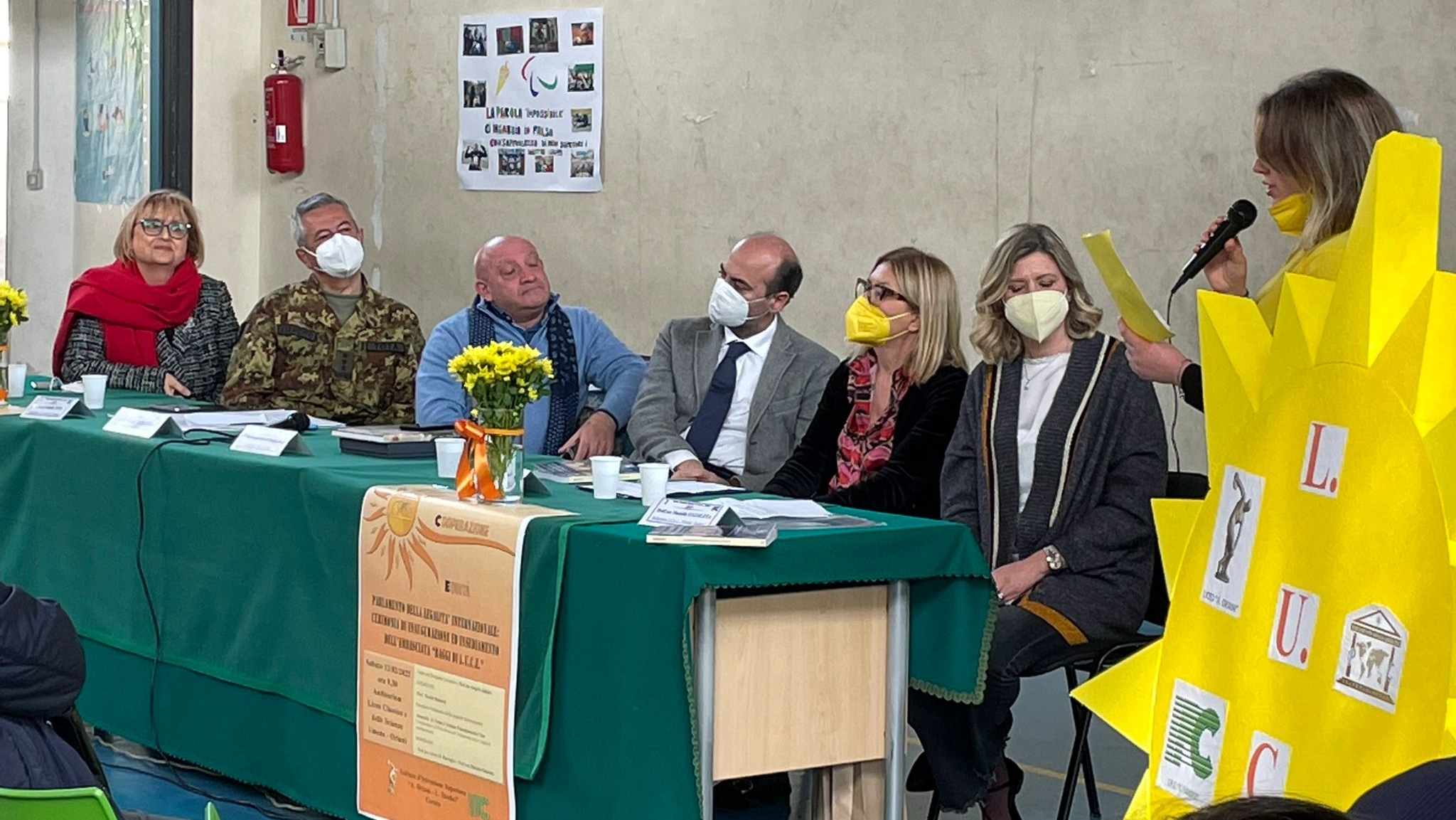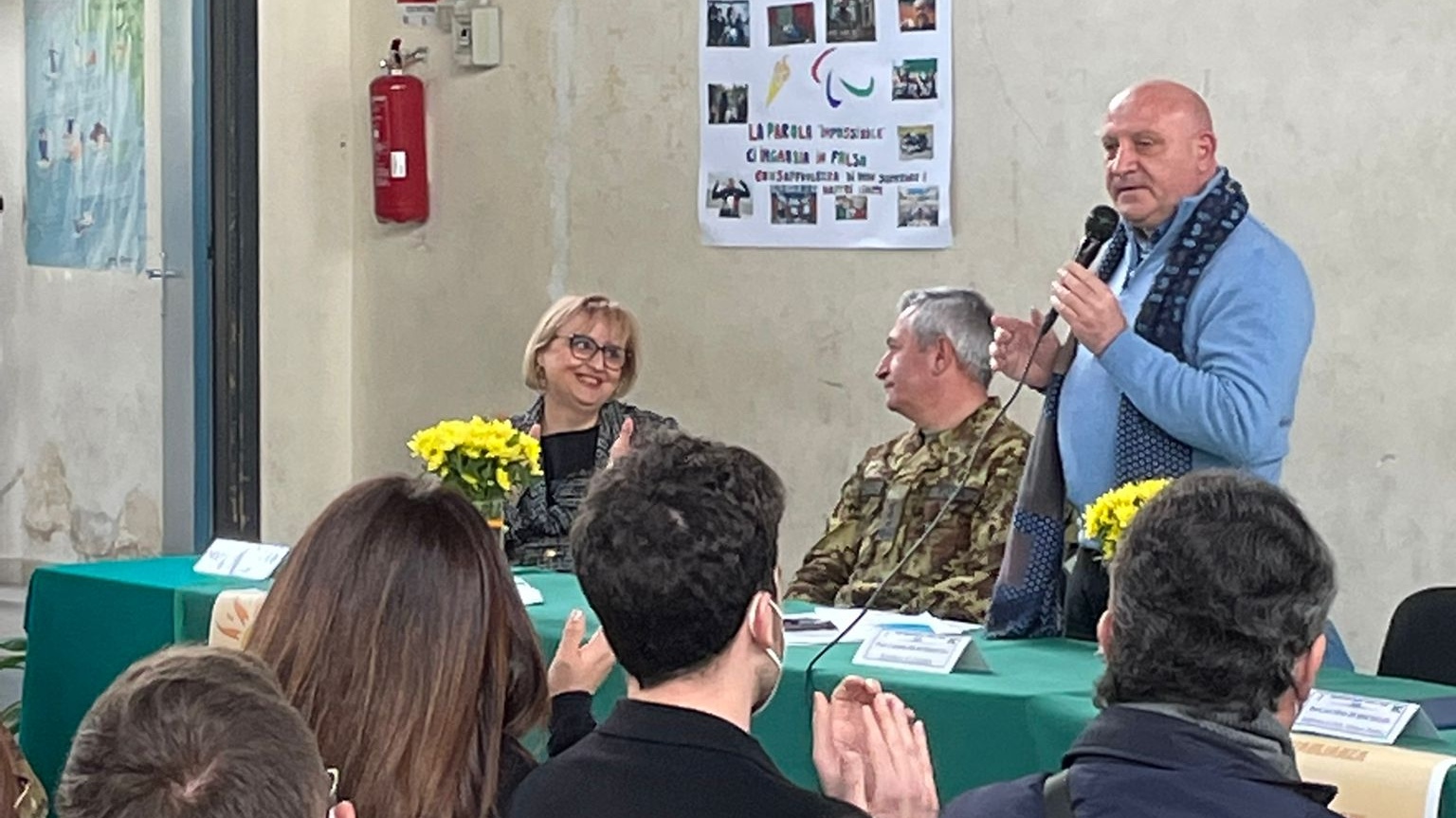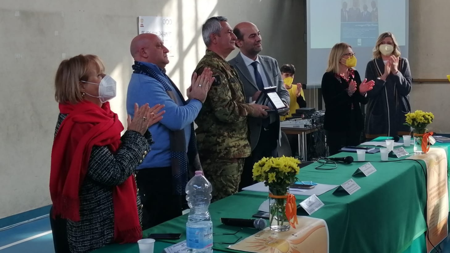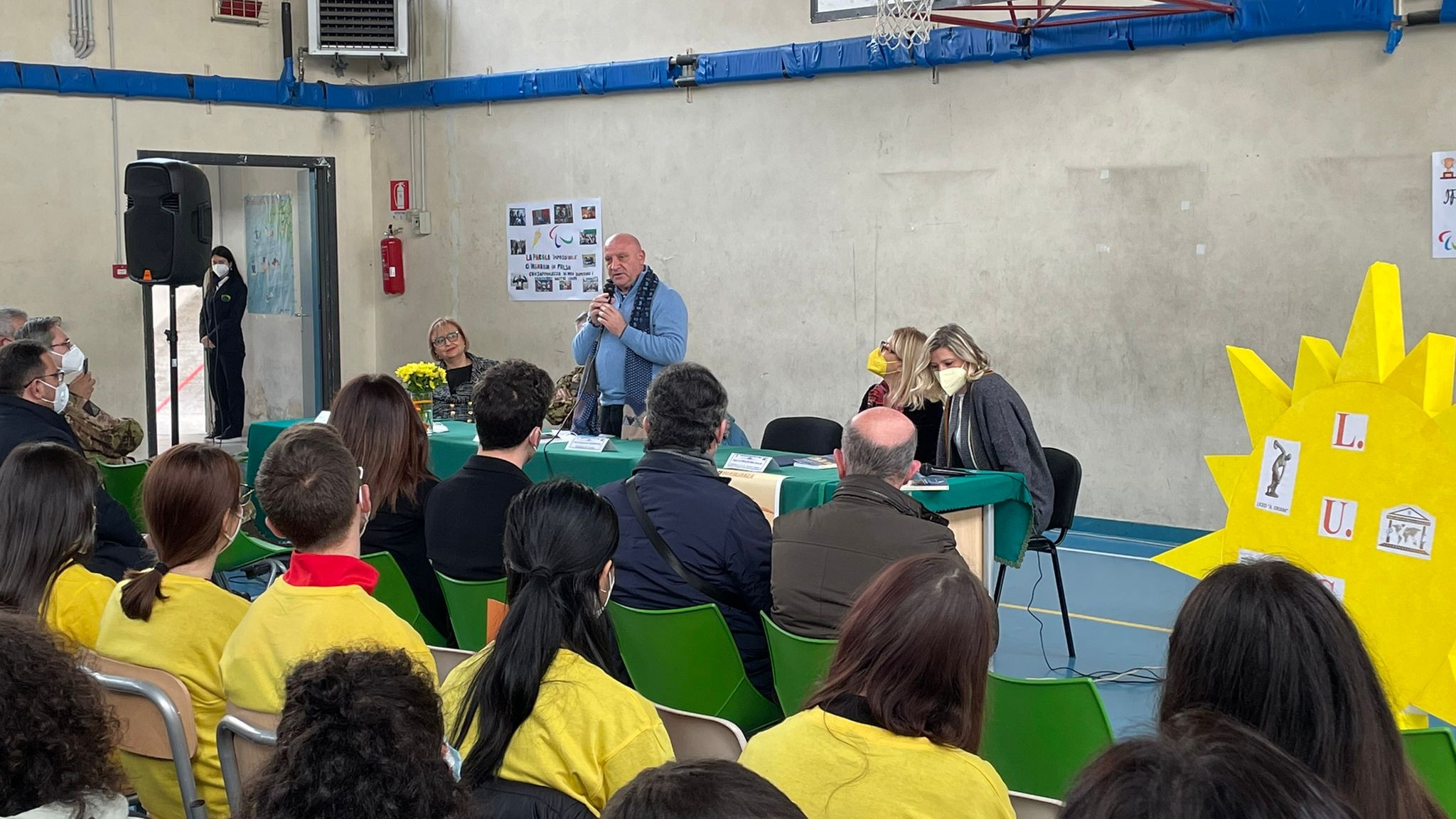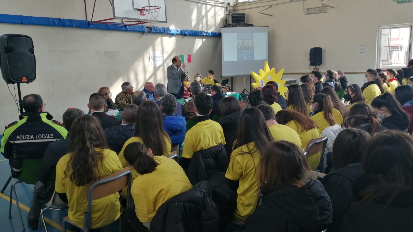 Ospiti dell’intensa e partecipata mattinata, ricca di spunti di riflessione, sono stati il prof. Nicolò Mannino, presidente del Parlamento Internazionale della Legalità, un movimento culturale apartitico di forte ispirazione cristiana, e il generale di Corpo d’Armata Giuseppenicola TOTA, comandante dell’Esercito Italiano Sud, che con le loro preziose testimonianze di impegno civile finalizzato alla diffusione del messaggio di legalità, hanno affascinato la platea di ragazzi presenti nella palestra, dove le consuete ore di “educazione fisica” hanno ceduto il passo a diverse ore di ‘”educazione ai valori della vita”: legalità, uguaglianza, cooperazione, equità; il tutto grazie anche alle docenti Silvia Di Bisceglie e Daniela Gataleta, moderatrici dell’ incontro.