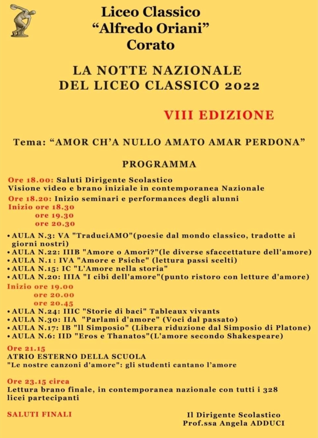 È un ‘occasione di riflessione sul senso della classicità e sulla sua attualità . Gli alunni si cimenteranno in performance, riflessioni, letture, esibizioni musicali a partire dal tema scelto per questa edizione: “ Amor c’ha nullo amato, amar perdona!”