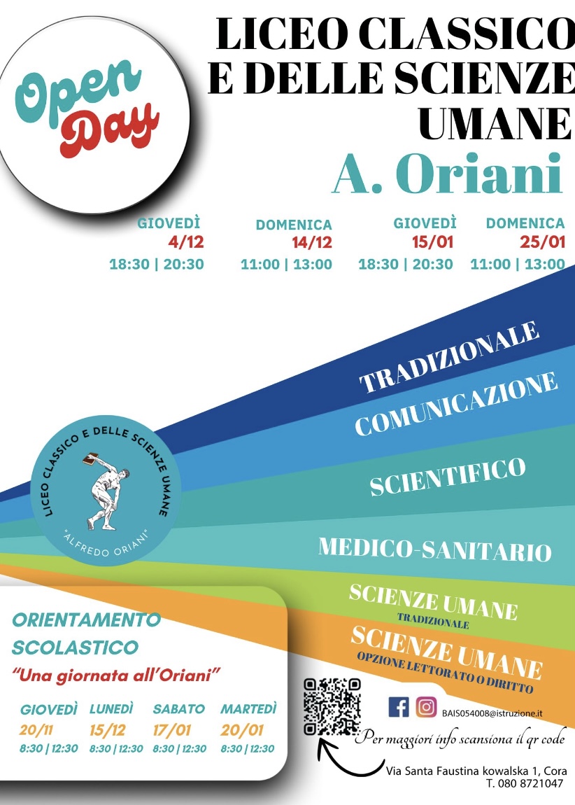 In un’epoca in cui i cambiamenti sempre più veloci della tecnologia e le sfide dell’economia richiedono non saperi limitati e limitanti, ma abilità spendibili a 360 gradi ed esigono capacità critica, elasticità mentale, solido bagaglio culturale, allenamento all’impegno, progettualità, l’ORIANI propone come sempre un’offerta formativa varia, nell’ambito della tradizione più che centenaria del Liceo Classico e in quella giovane del Liceo delle Scienze Umane.
