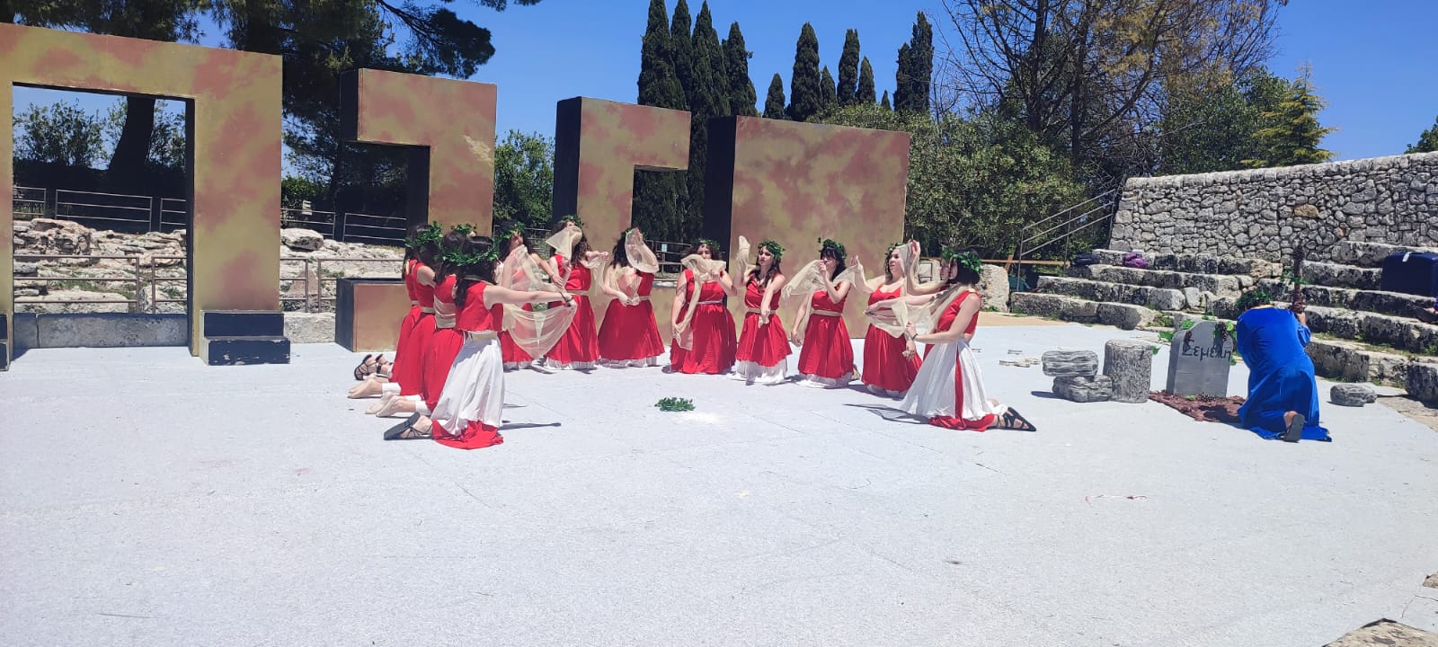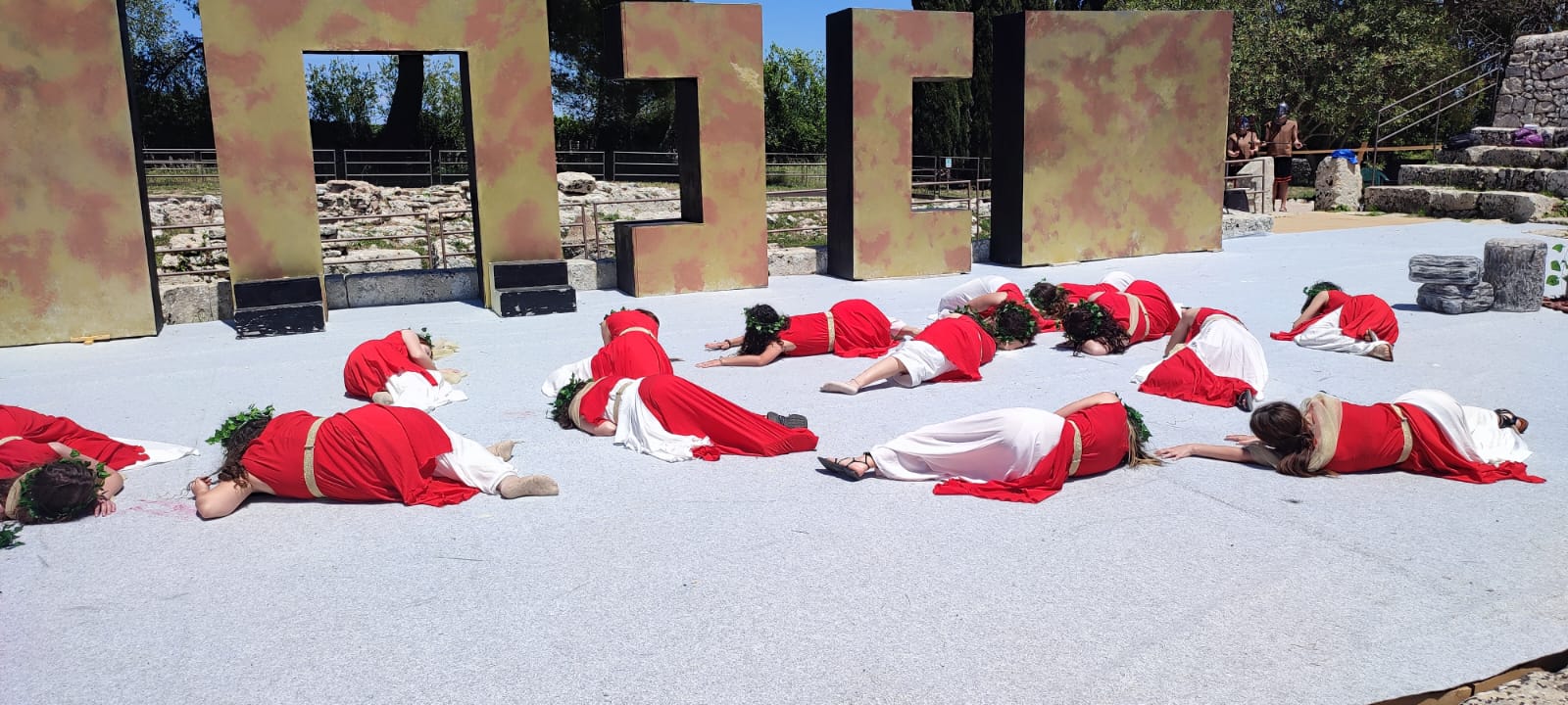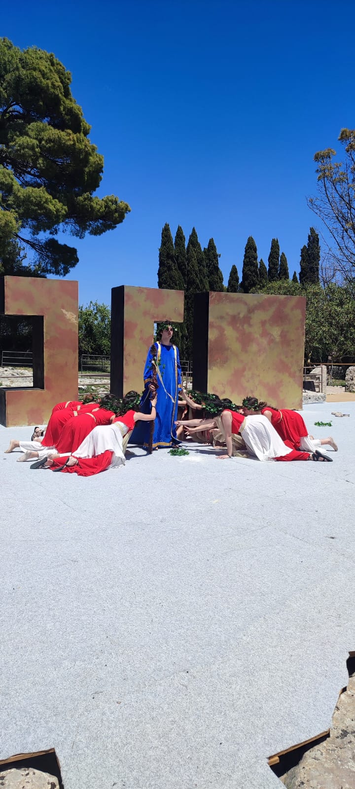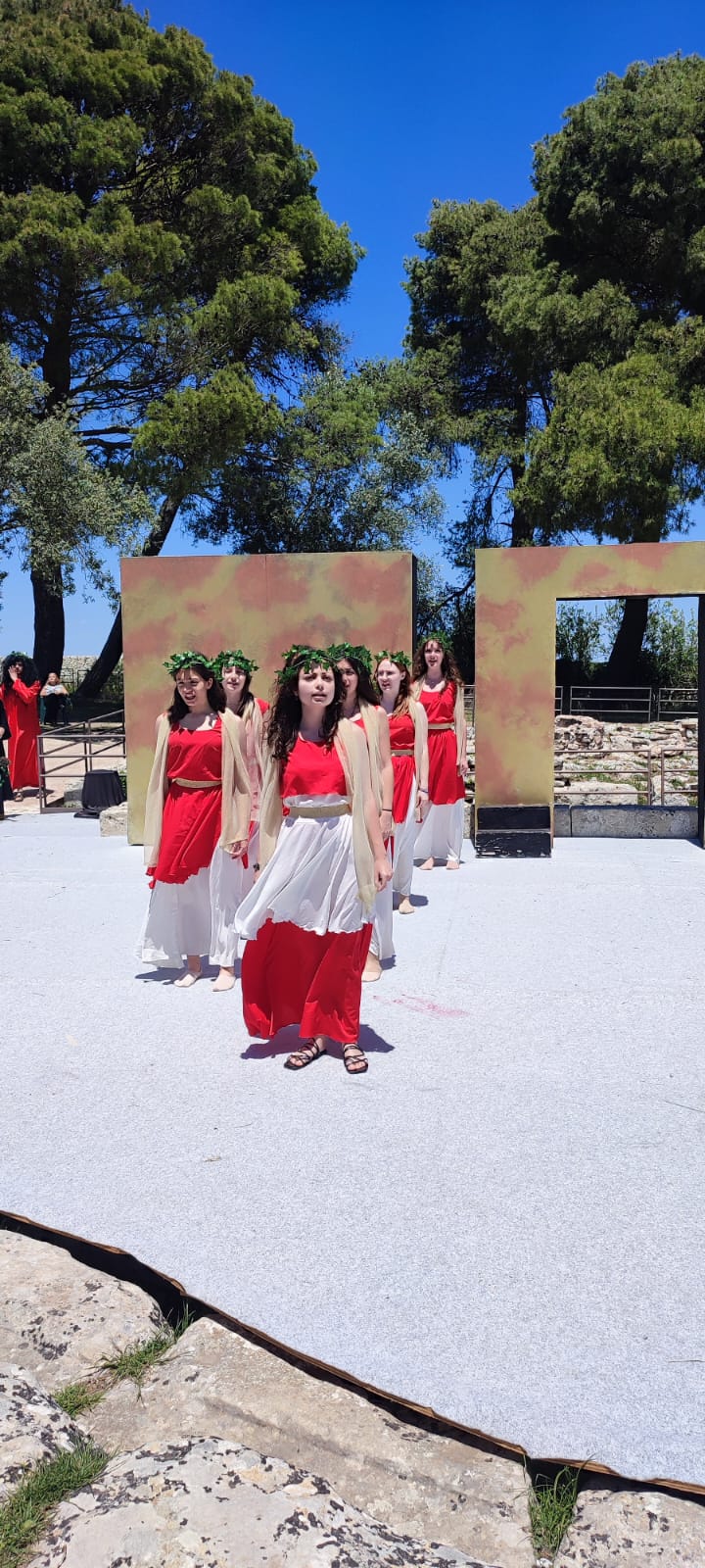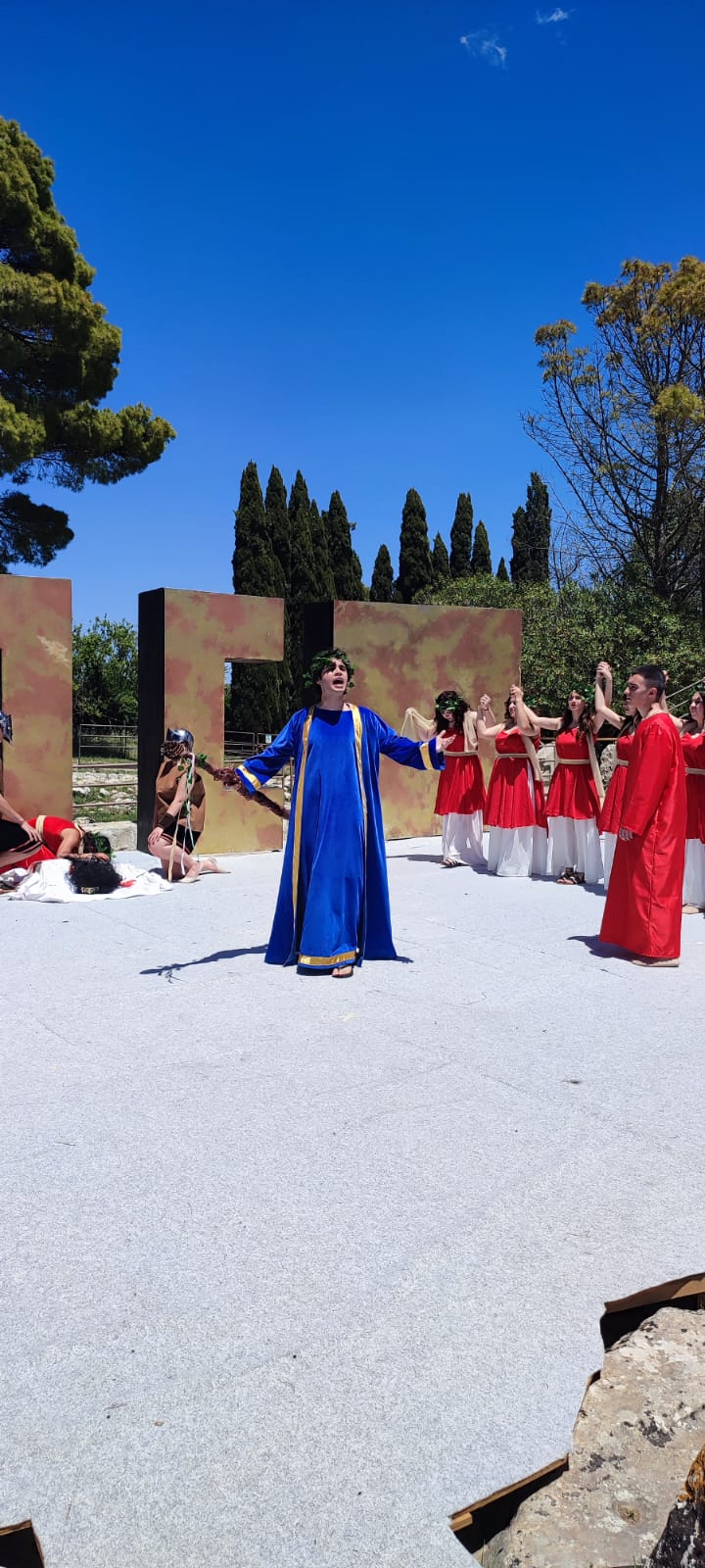 Un carico non da poco per dei giovani attori, invogliati a lasciar andare ogni freno sulla skenè grazie anche alla visione, la sera precedente, della grandiosa messa in scena della “Fedra- Ippolito portatore di corona” al teatro greco di Siracusa appartenente alla stagione teatrale annuale organizzata dall’Inda (istituto nazionale del dramma antico). Quella passione ardente presente negli attori professionisti diffonde la sua luce e mostra la natura dell’uomo di ogni tempo, impetuoso, istintivo, libero, che afferma la vita.