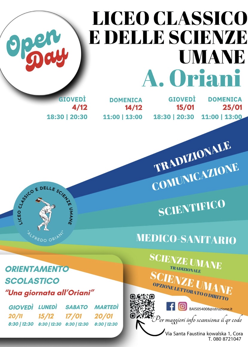 In un’epoca in cui i cambiamenti sempre più veloci della tecnologia e le sfide dell’economia richiedono non saperi limitati e limitanti, ma abilità spendibili a 360 gradi ed esigono capacità critica, elasticità mentale, solido bagaglio culturale, allenamento all’impegno, progettualità, l’ORIANI propone come sempre un’offerta formativa varia, nell’ambito della tradizione più che centenaria del Liceo Classico e in quella giovane del Liceo delle Scienze Umane.