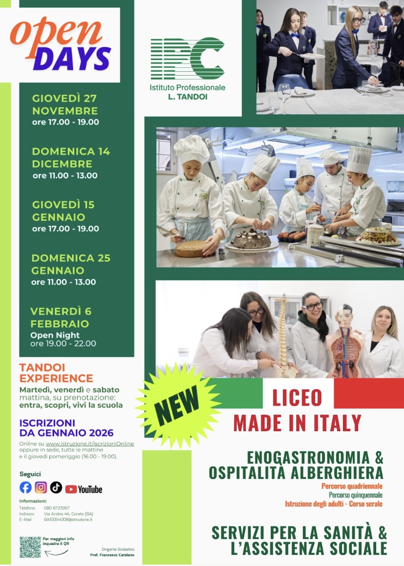 Una scuola che unisce cultura, creatività e spirito imprenditoriale, arricchita da laboratori e attività in collaborazione con le imprese del territorio. Il nuovo Liceo sarà presentato in anteprima durante l’Open Day di domenica 14 dicembre, dalle 11 alle 13, nella sede dell’Istituto in via Andria 44. Durante l’Open Day, gli studenti potranno vivere una mattinata da “alunni del Tandoi”, entrando nei laboratori e sperimentando in prima persona cosa significa studiare in un ambiente dinamico e reale. Oltre alle novità, il Tandoi conferma l’offerta formativa che include: il percorso quinquennale in Enogastronomia e Ospitalità alberghiera e in Servizi per la Sanità e l’Assistenza sociale, il corso serale per adulti, pensato per chi desidera ottenere un diploma o riqualificarsi conciliando studio, lavoro e famiglia. Formazione pratica, laboratori specialistici e una rete consolidata di aziende partner rendono ogni percorso un ponte verso il mondo professionale.