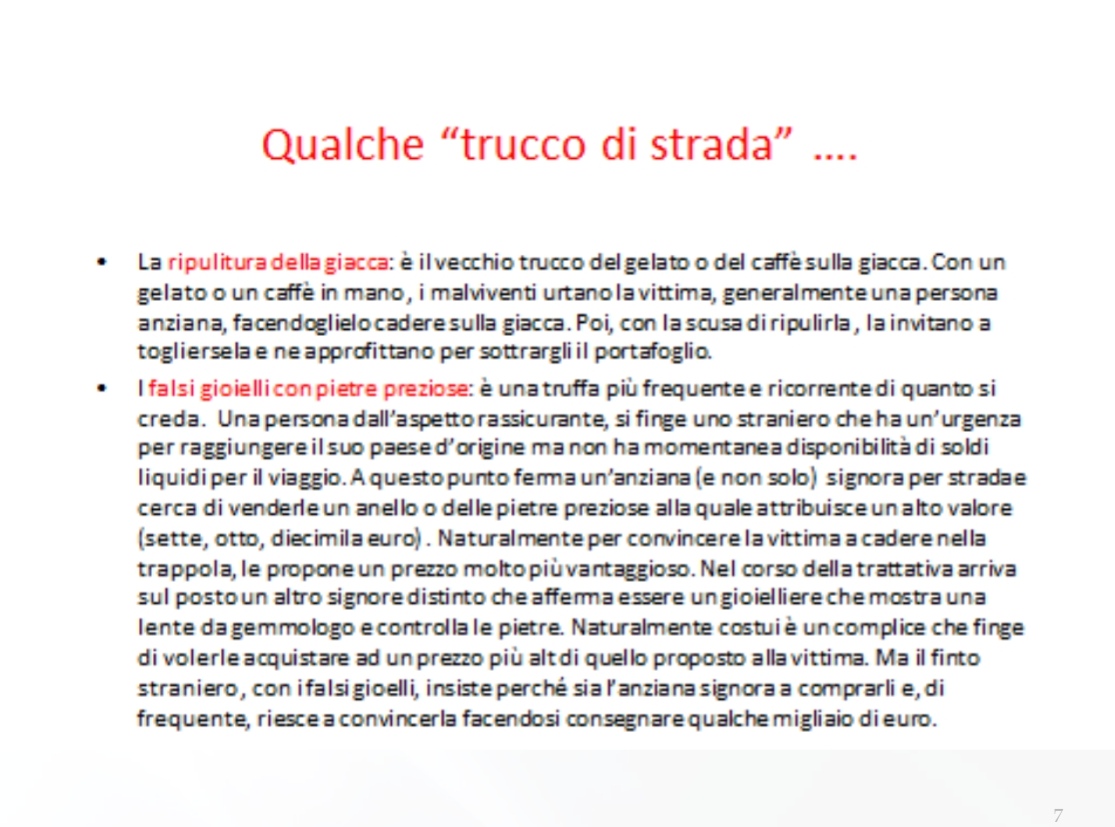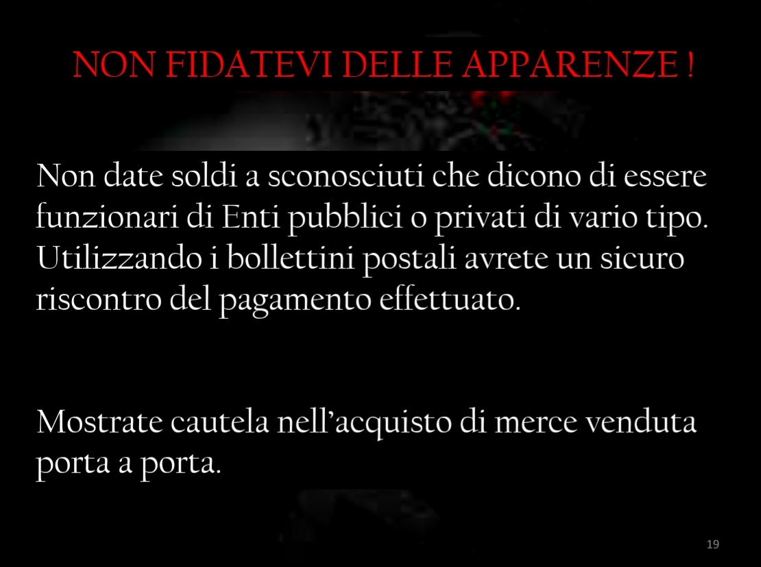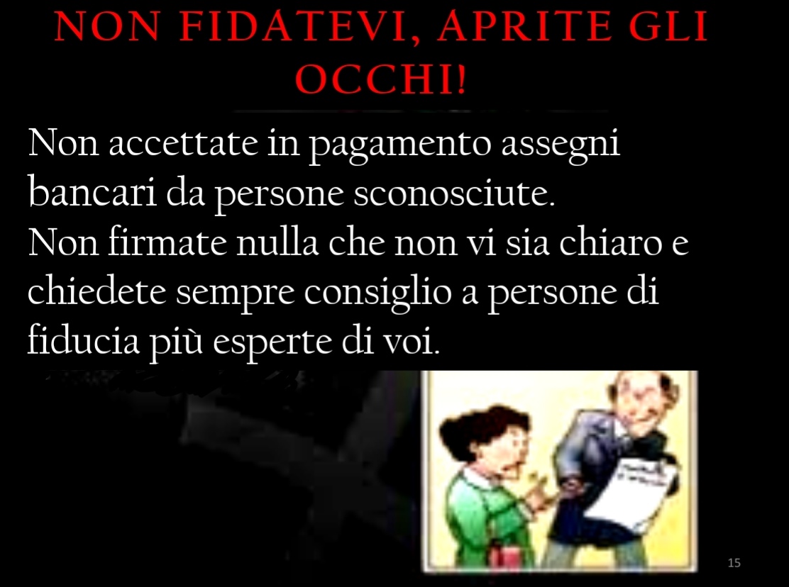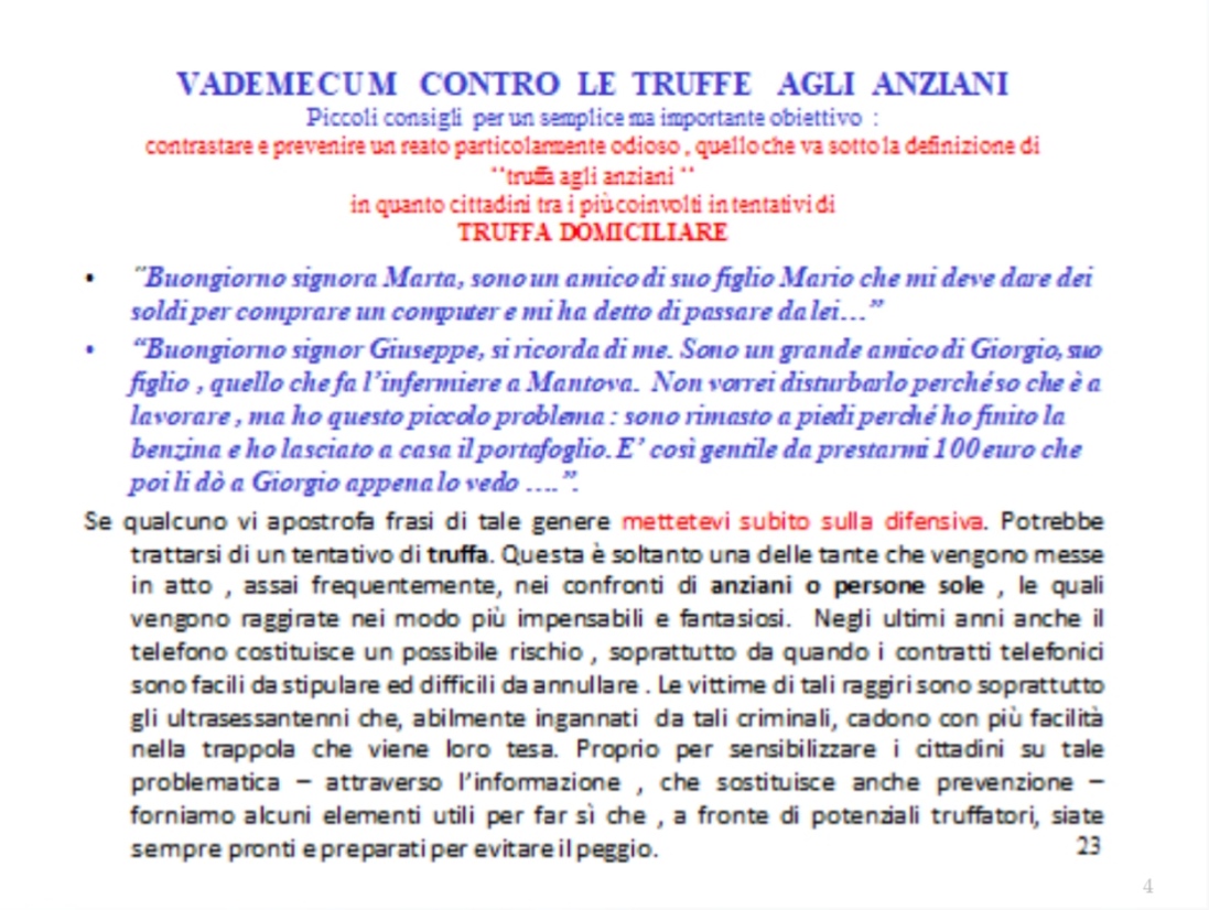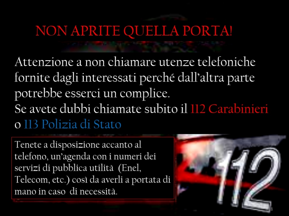 Ieri sera, 11 aprile, presso la sede del Rotary Club di Corato, si è tenuto un validissimo incontro avente come tematica la difesa degli anziani dalle truffe. Relatore principale dell’evento è stato il Comandante della Stazione dei Carabinieri di Corato, luogotenente Francesco Dimiccoli, introdotto dalla presentazione del presidente del Rotary coratino Pasquale Tarricone. Il Comandante, maresciallo Dimiccoli ha dissertato circa le varie casistiche che vedono gli anziani come vittime di raggiri e truffe, elencando svariate tipologie e metodiche dell’azione criminosa,portando esempi tratti dalla cronaca quotidiana ma anche dispensando preziosi consigli per difendersi dal reato in questione , raccomandazioni accolte dal pubblico interessato, con molta attenzione.