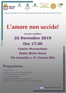 In particolare, il 22 novembre 2019 – presso la Sala Luisa Piccarreta, Via Leonello 9 Corato – in occasione della Giornata Internazionale contro la violenza sulle donne proclamata per il 25 novembre, si terrà un incontro di sensibilizzazione sul tema: “L’amore non uccide”.
