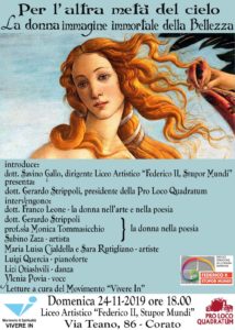 la Pro Loco “Quadratum” insieme al Movimento “Vivere In” ed in collaborazione con il Liceo Artistico “Federico II Stupor Mundi” presenta la 4a edizione di “Per l’altra metà del cielo” che si terrà in occasione della Giornata Mondiale contro la violenza sulle donne Domenica 24 Novembre 2019 alle ore 18.00 presso l’Auditorium del Liceo Artistico in Via Teano, 86.