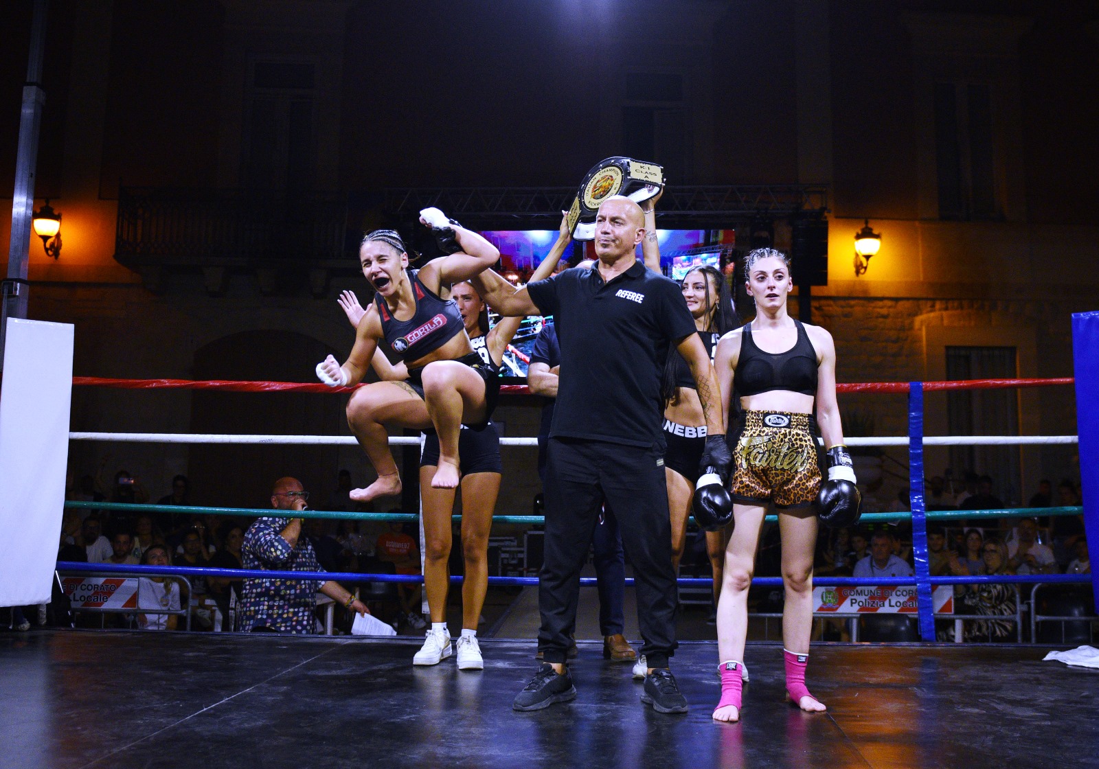 Una piazza Cesare Battisti gremita, con centinaia di spettatori, entusiasti dello spettacolo a cui stavano assistendo, ossia la 7^ edizione della Kickboxing in the night, organizzata dalla Tigers Gym del vulcanico maestro Mario Roselli ed il patrocinio del comune di Corato.