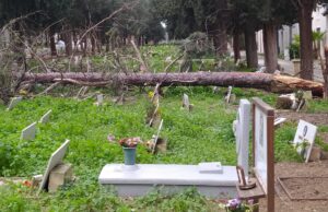 Corato, crolla un grande albero sulle tombe del cimitero (Foto)