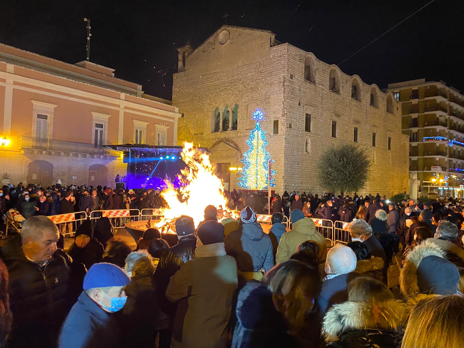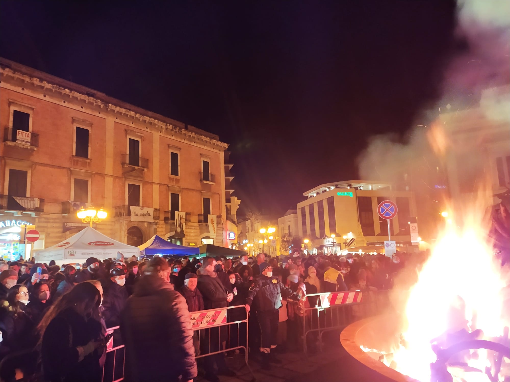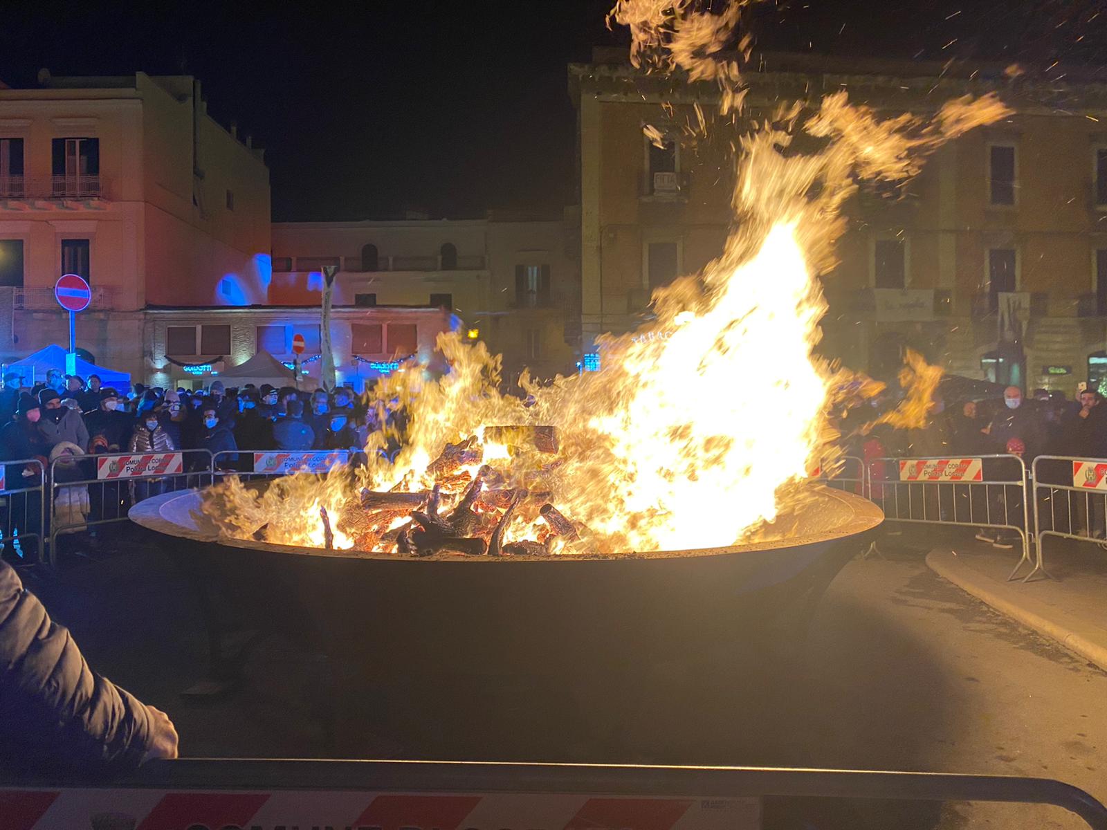 Il freddo e la pioggia, che fino al pomeriggio ha bagnato la città, non sono riusciti a fermare la realizzazione del programma previsto per l’edizione 2021 del falò di Santa Lucia, domenica 12 dicembre. La Pro Loco Quadratum, nella persona del suo presidente, Gerardo Giuseppe Strippoli, con il Comune di Corato, con il Patrocinio della Regione Puglia, del Parco Nazionale dell’Alta Murgia e dell’Unpli Puglia, è riuscita a portare tanti coratini in piazza nel tradizionale appuntamento della vigilia di Santa Lucia. Dopo la Messa celebrata in Chiesa Matrice, il Sindaco e gli organizzatori si sono spostati davanti il grande braciere, in piazza Cesare Battisti, per accendere la catasta di legno, dopo la benedizione di don Peppino Lobascio. Bancarelle e stand di prodotti tipici artigianali, lungo Corso Mazzini e in piazza hanno attratto i concittadini che, fedeli alla tradizione, si sono “sentiti comunità “, come il Sindaco ha affermato. Egli ha voluto dedicare soprattutto ai giovani questa manifestazione, affinché dopo un periodo di buio, si torni alla luce. Il presidente Strippoli ha voluto ringraziare Renato Bruno, della Pro Loco di Montemesola per la sua presenza, che ha portato in piazza la possibilità di assaporare le pettole tarantine, e gli ospiti che hanno allietato il pubblico sul palco allestito da Sonido. A scaldare i presenti sotto il palco la musica di Silvia Iannone, di Ryan 05 con il suo gruppo, e infine il gruppo folkloristico Zig Zaghini che, dal Molise, ha incantato i presenti. Trasportati nel folklore i riti del corteggiamento, della mietitura, del raccolto, della vita contadina con il ballo si vestono di vivacità e sorrisi. Gli stand di Granoro con il suo primo piatto da degustare, dell’istituto Alberghiero Tandoi con il suo PanCataldo della Pasticceria Torinese, dell’Unitalsi e del Parco dell’Alta Murgia sono state tappe affollate di una manifestazione storica che rientra tra i riti antichi del fuoco dedicato a Santa Lucia. Possa Corato essere illuminata da germi di speranza in periodi ancora difficili, mentre ci prepariamo alle feste natalizie apportatrici di desideri di gioia ed unione.